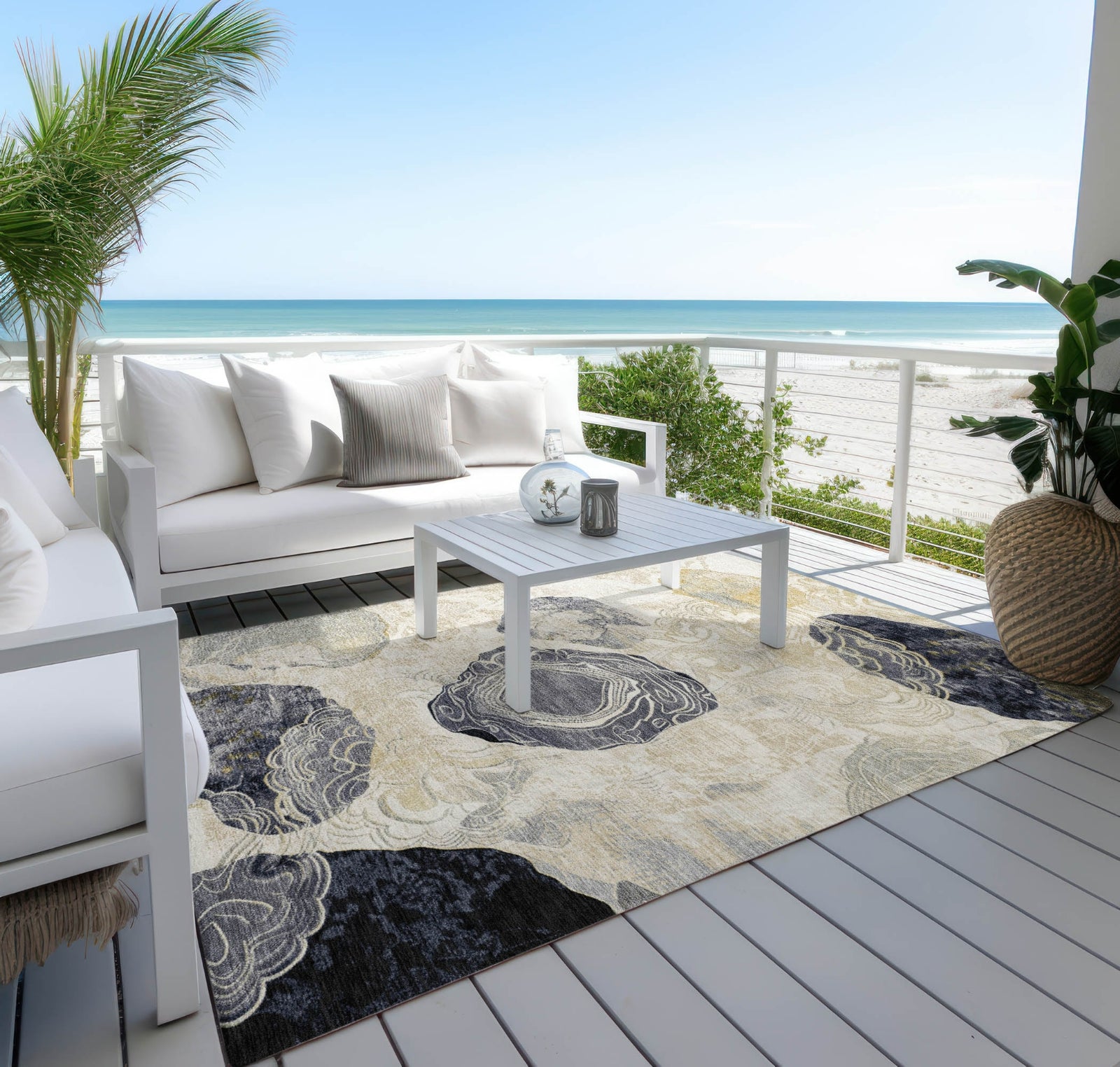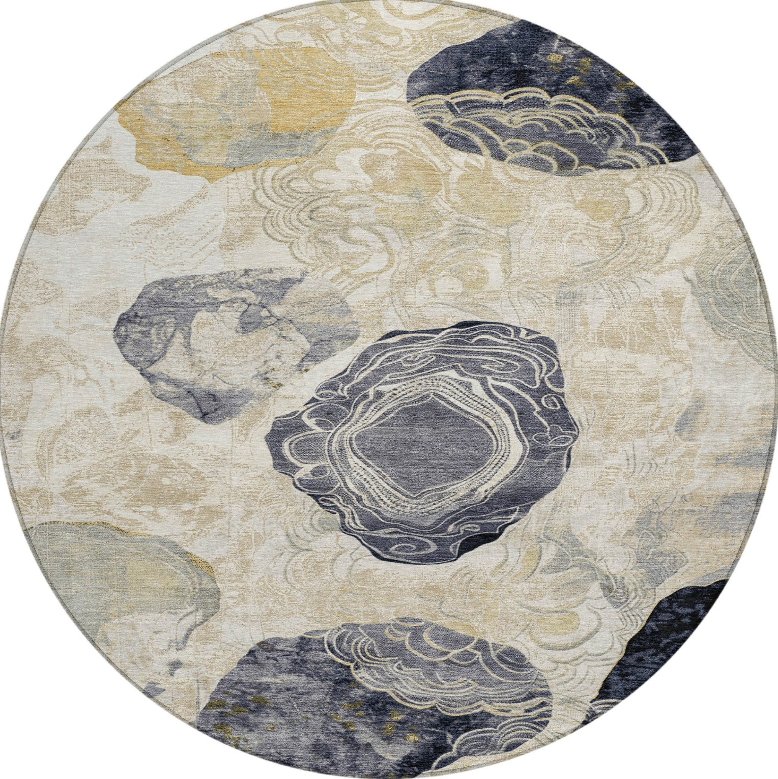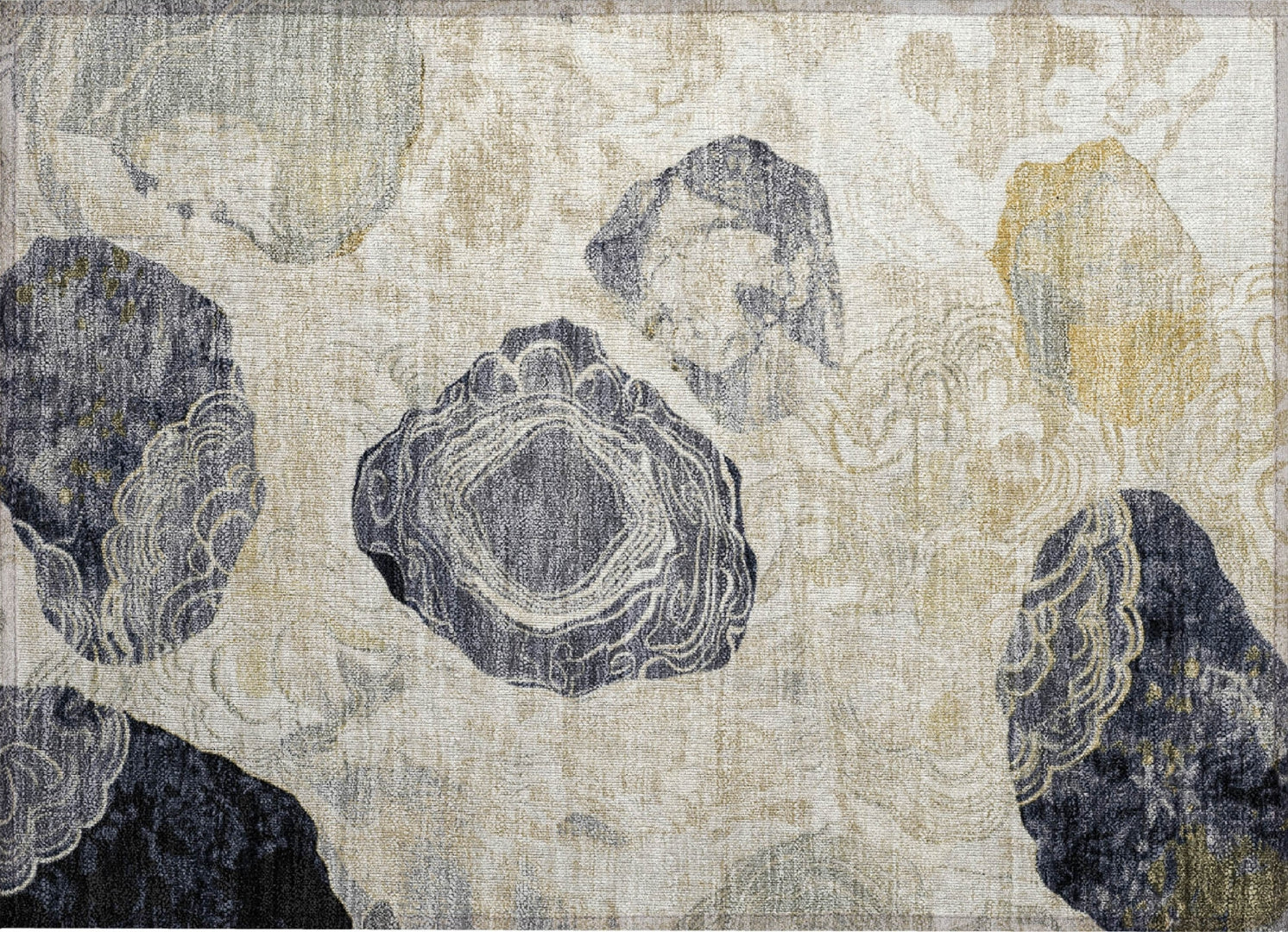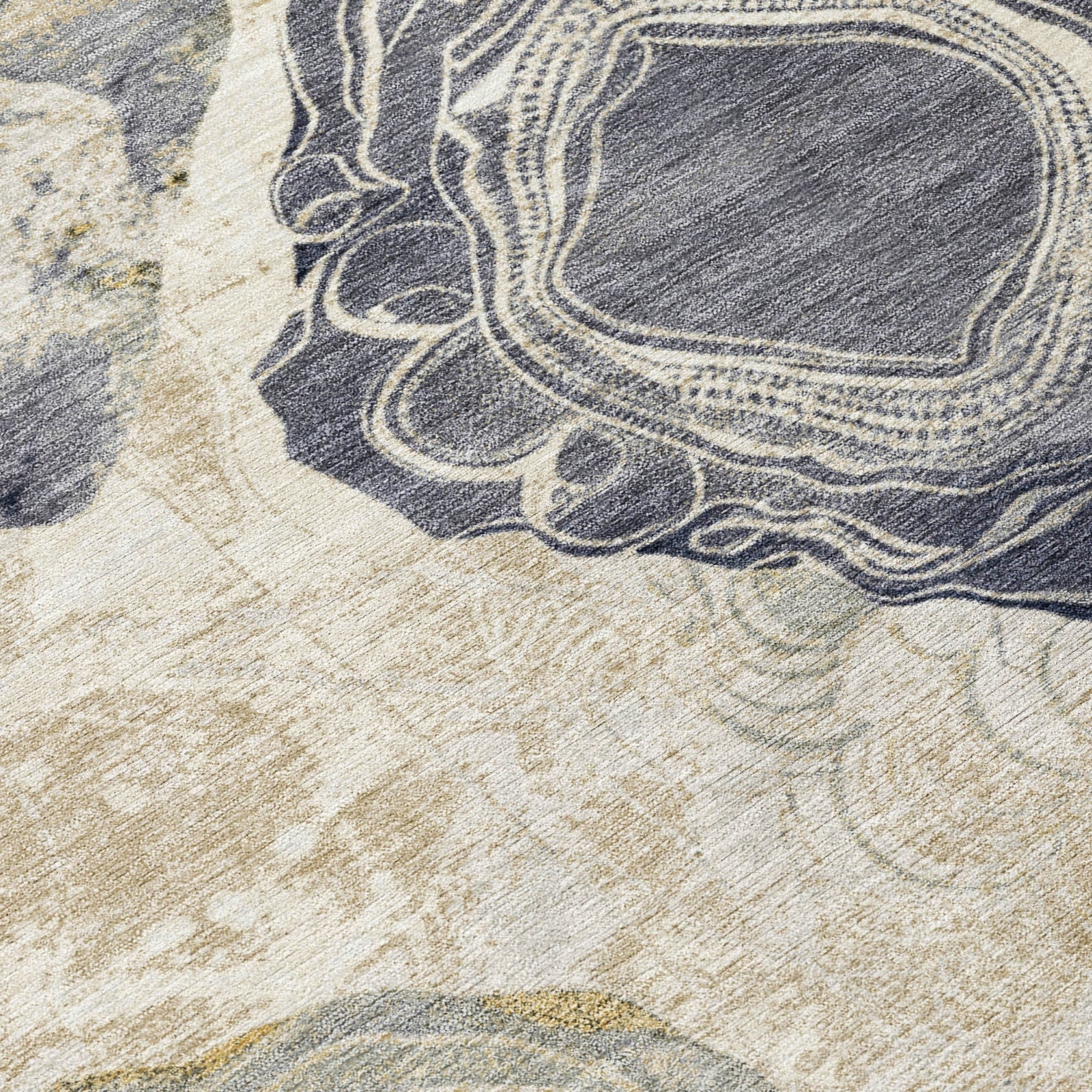 Featuring an elegant geometric pattern, this transitional rug displays stone-like motifs with delicate rings. The sophisticated blend of stone textures and fine ring details adds a modern touch to any decor. UV stabilized for lasting durability, this rug is suitable for indoor and outdoor settings, preserving its attractive design through varied use. Its ultra-thin profile ensures a smooth fit under furniture, and it's machine-washable for easy cleaning. Ideal for family and pet-friendly spaces, this rug merges stylish design with functional benefits.