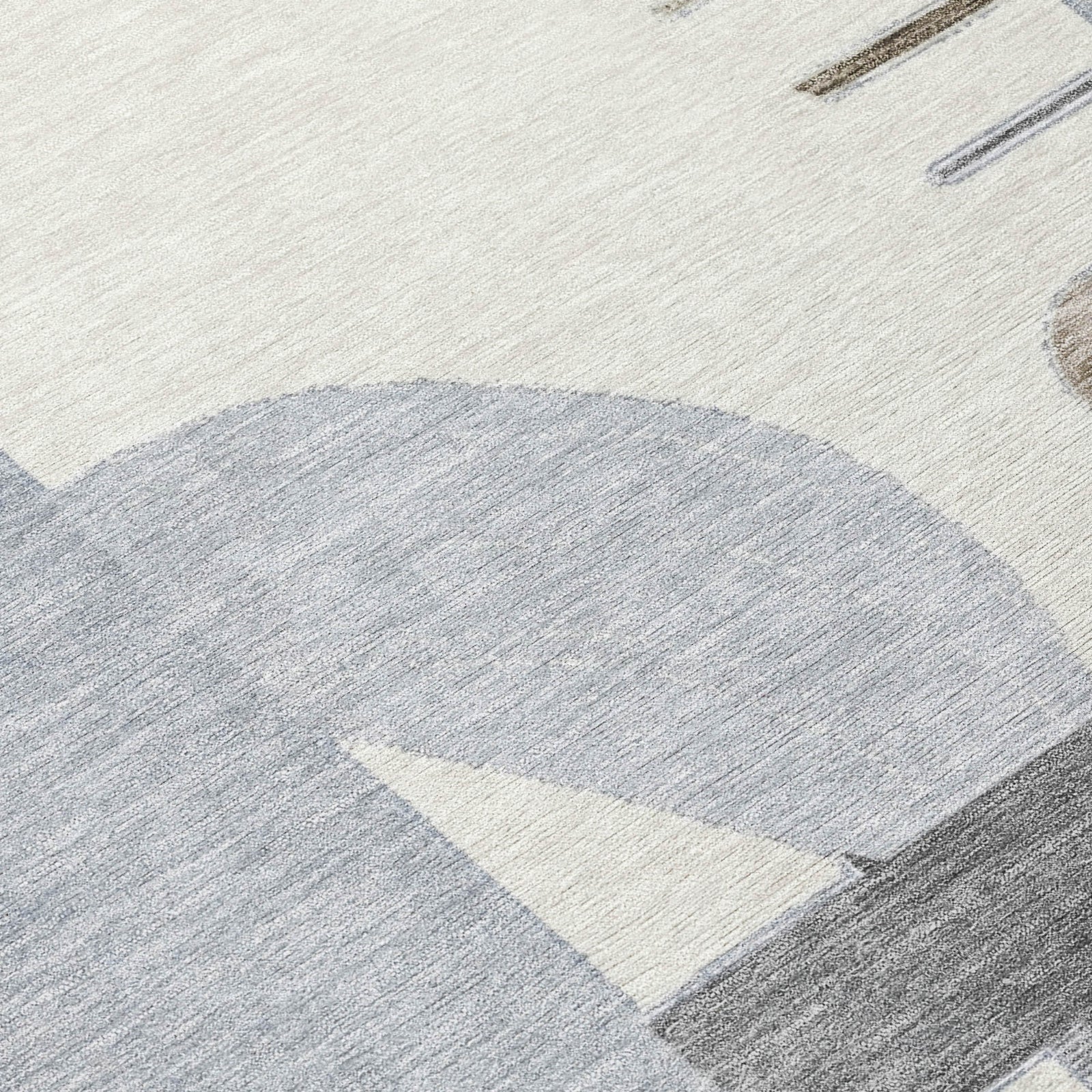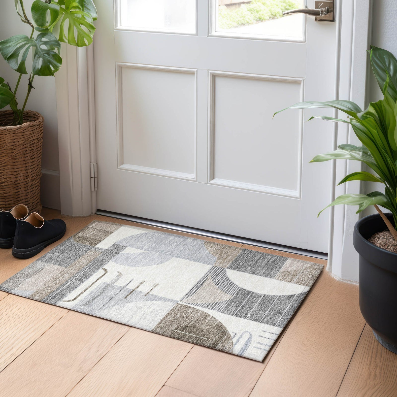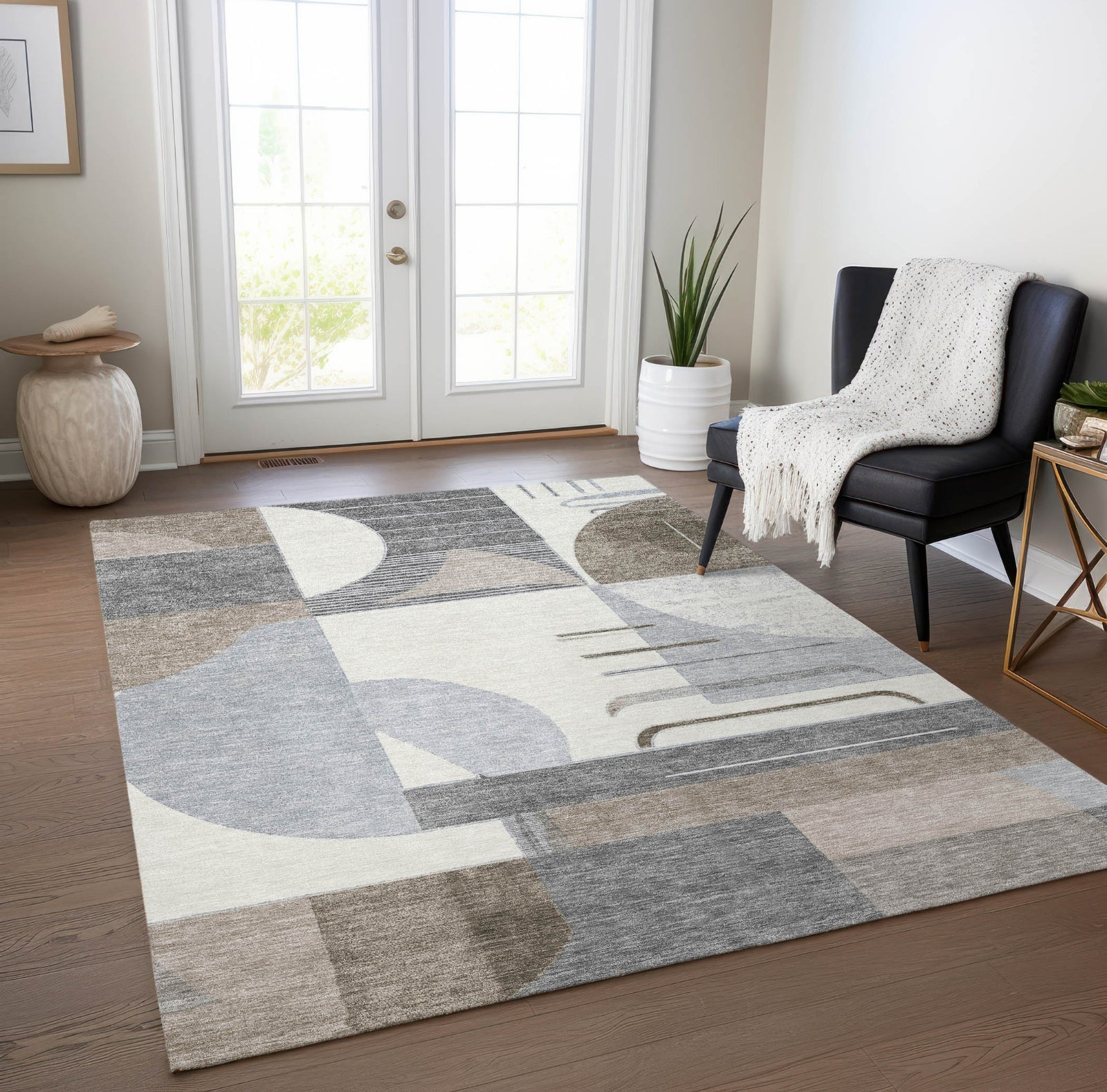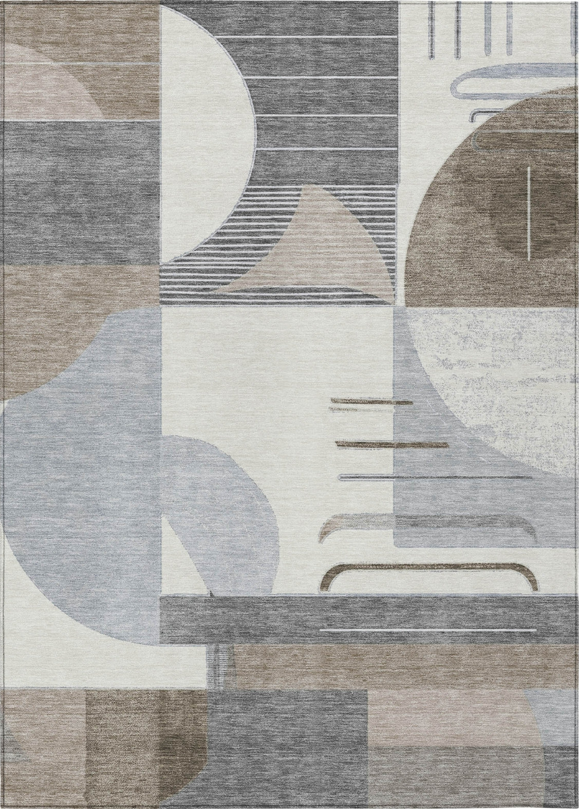 This transitional rug features a geometric mix of stripes, semi-circles, and rectangular shapes, creating a pattern that enhances your living space with a modern touch. The diverse design elements come together to form an eye-catching look. UV stabilized to resist fading, this rug remains vibrant in various settings, indoors or out. Its ultra-thin profile fits smoothly under furniture, and it is machine-washable for easy cleaning. Perfect for family and pet-friendly areas, this rug blends contemporary style with functional features.