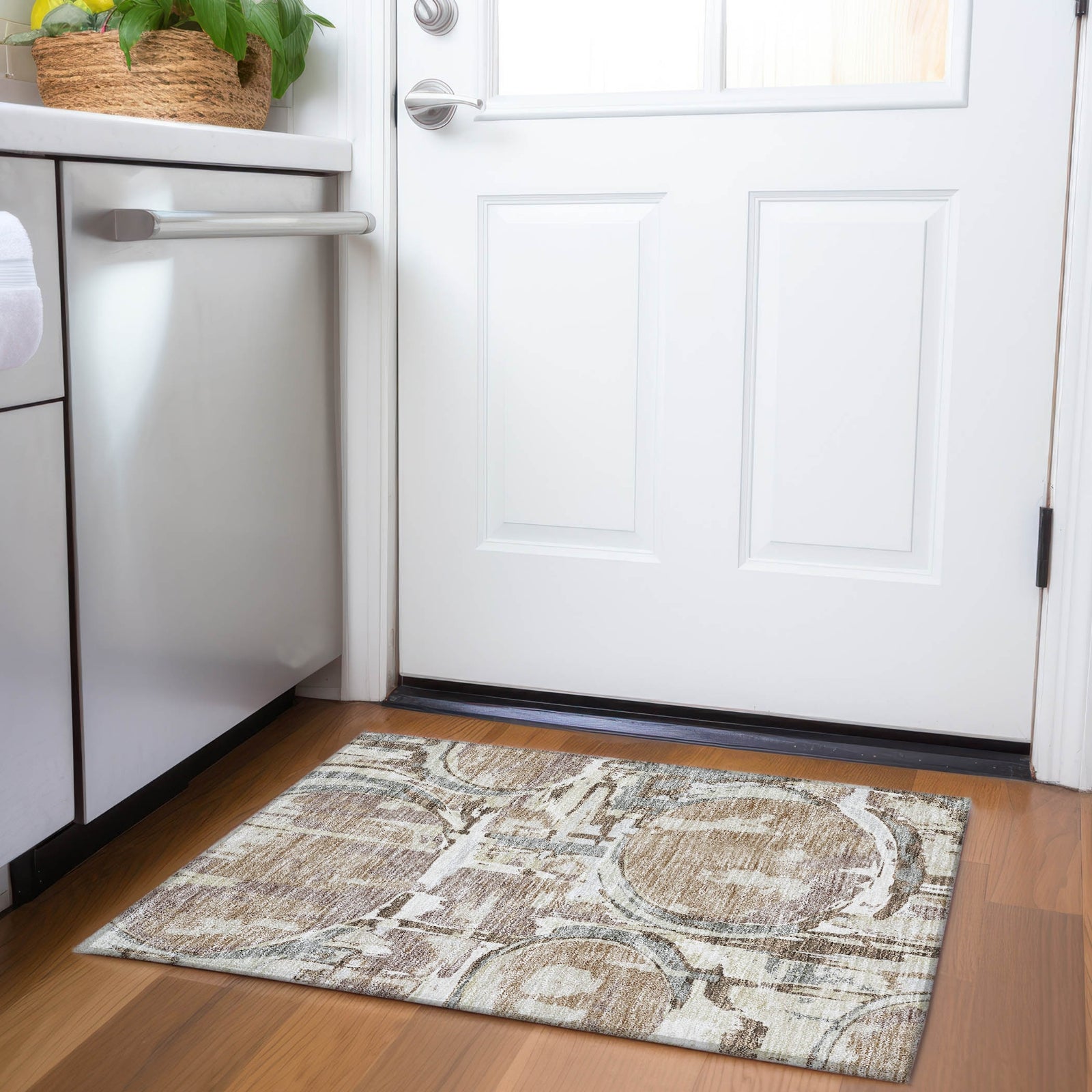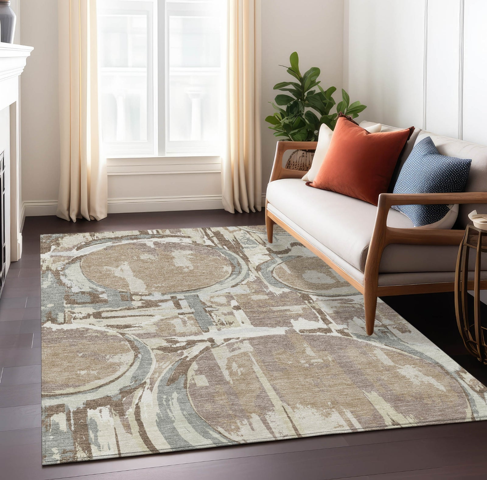 Accentuate your space with our sophisticated area rug, where multi-circle patterns are artfully mixed with abstract-shaped textures, offering a transitional and geometric flair. The pattern is visually striking and adds a contemporary touch. Designed for adaptability, it's UV stabilized for different environments, ultra-thin for effortless integration, and machine-washable, making it a superb choice for family and pet-friendly homes.