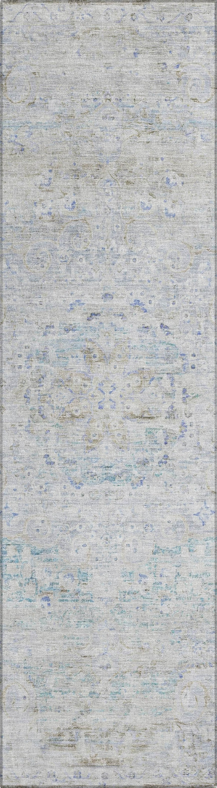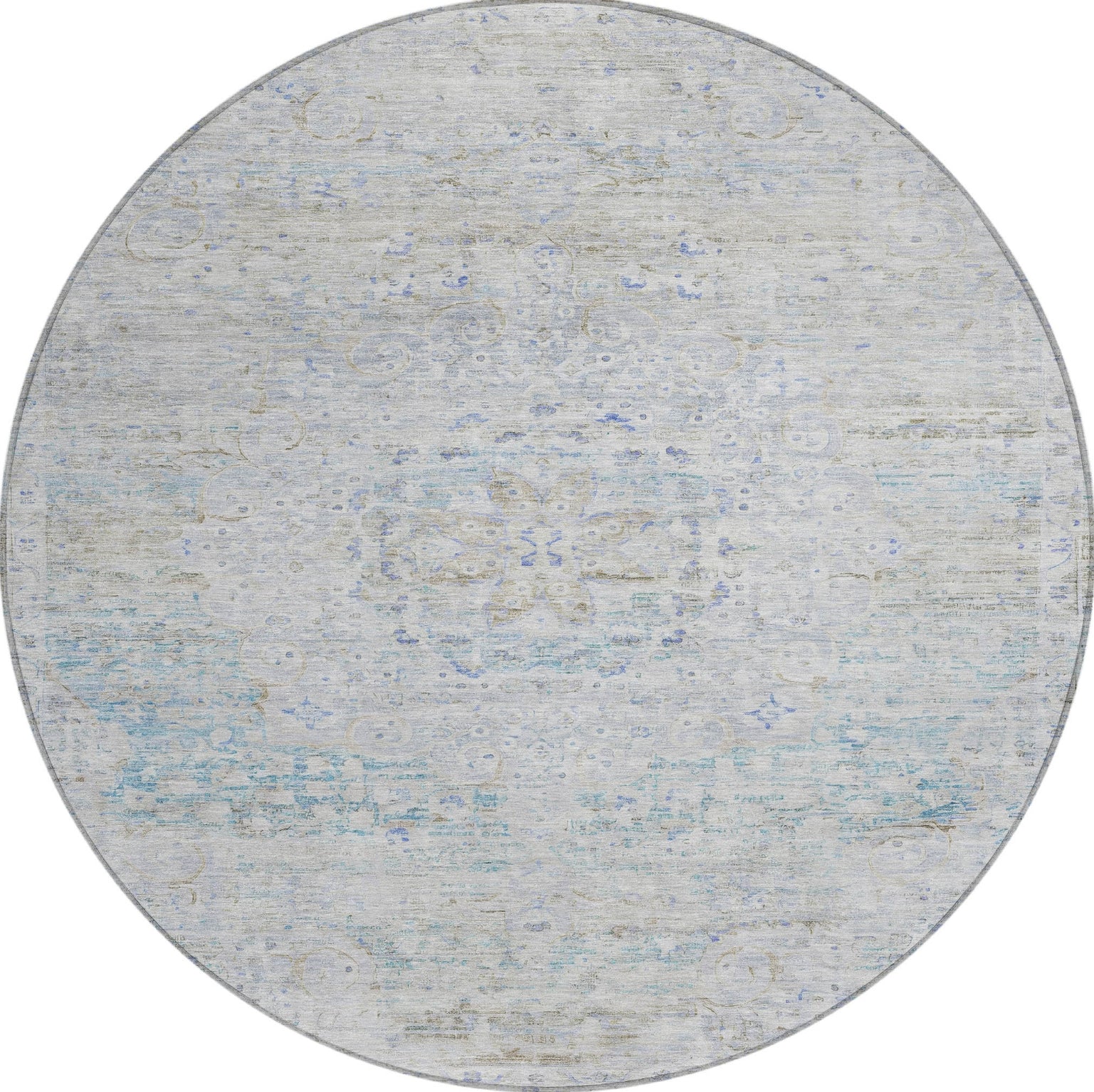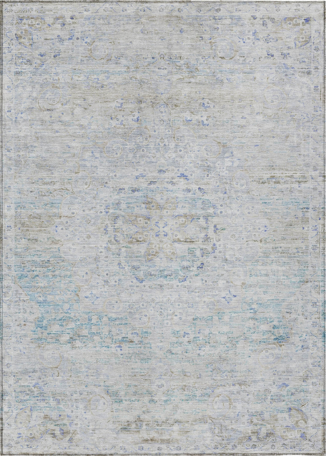 This traditional rug boasts a vintage distressed border framing a central medallion, offering a classic design with timeless elegance. The medallion's intricate details and the weathered border enhance any room with a touch of historical sophistication. UV stabilized for durability, this rug is suited for both indoor and outdoor use, maintaining its stylish look over time. The ultra-thin construction ensures it integrates easily under furniture, and it's machine-washable for convenient maintenance. Family and pet-friendly, this rug combines traditional style with modern practicality.