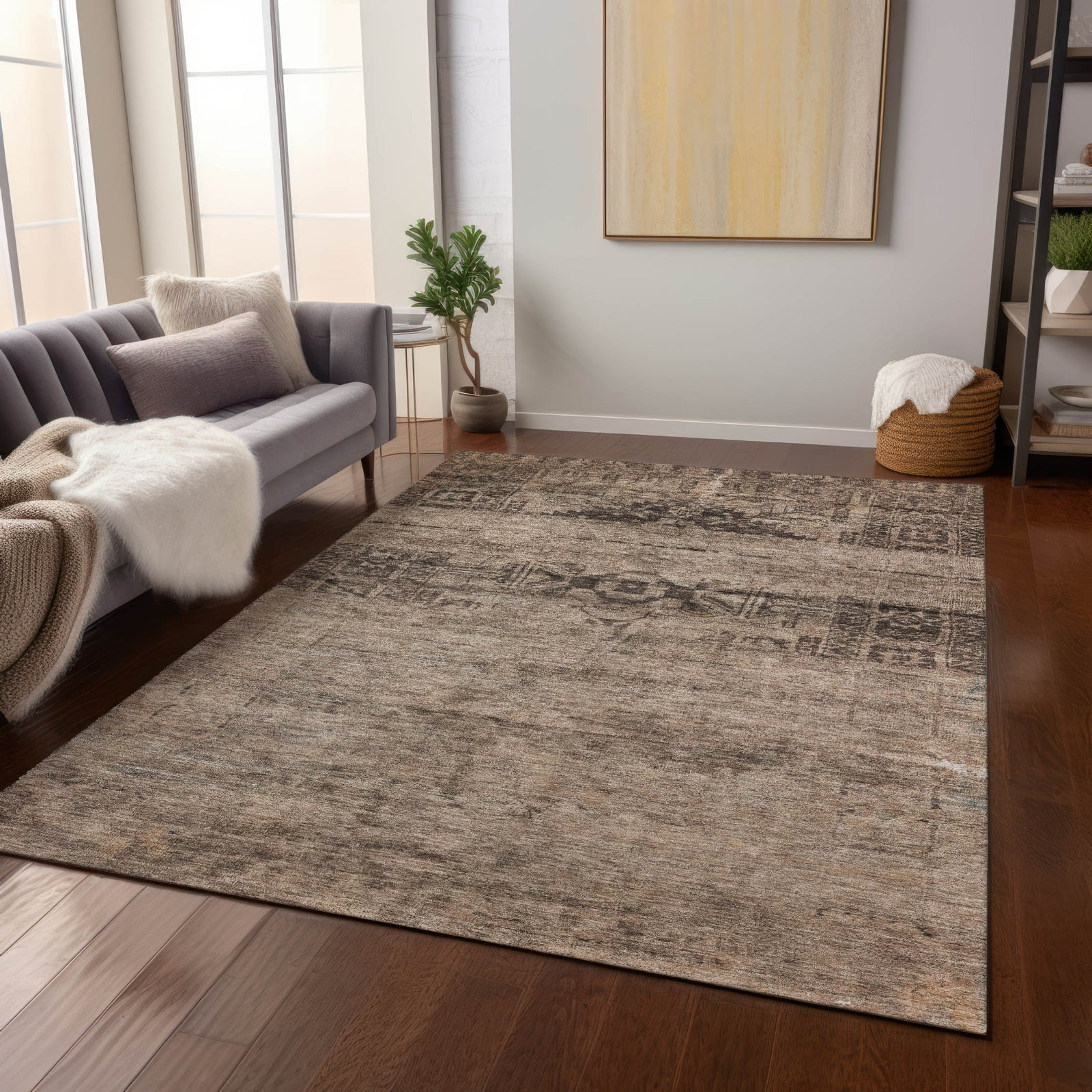 This transitional rug showcases a unique pattern where one half features intricate motifs and the other half displays a distressed effect, combining global influences with contemporary design. The visual contrast between the detailed and weathered sections creates a striking and sophisticated appearance. UV stabilized for durability, this rug is perfect for both indoor and outdoor environments, preserving its chic look over time. The ultra-thin profile ensures easy placement under furniture, and it's machine-washable for convenient maintenance. Ideal for family and pet-friendly spaces, this rug merges distinctive design with functional benefits.