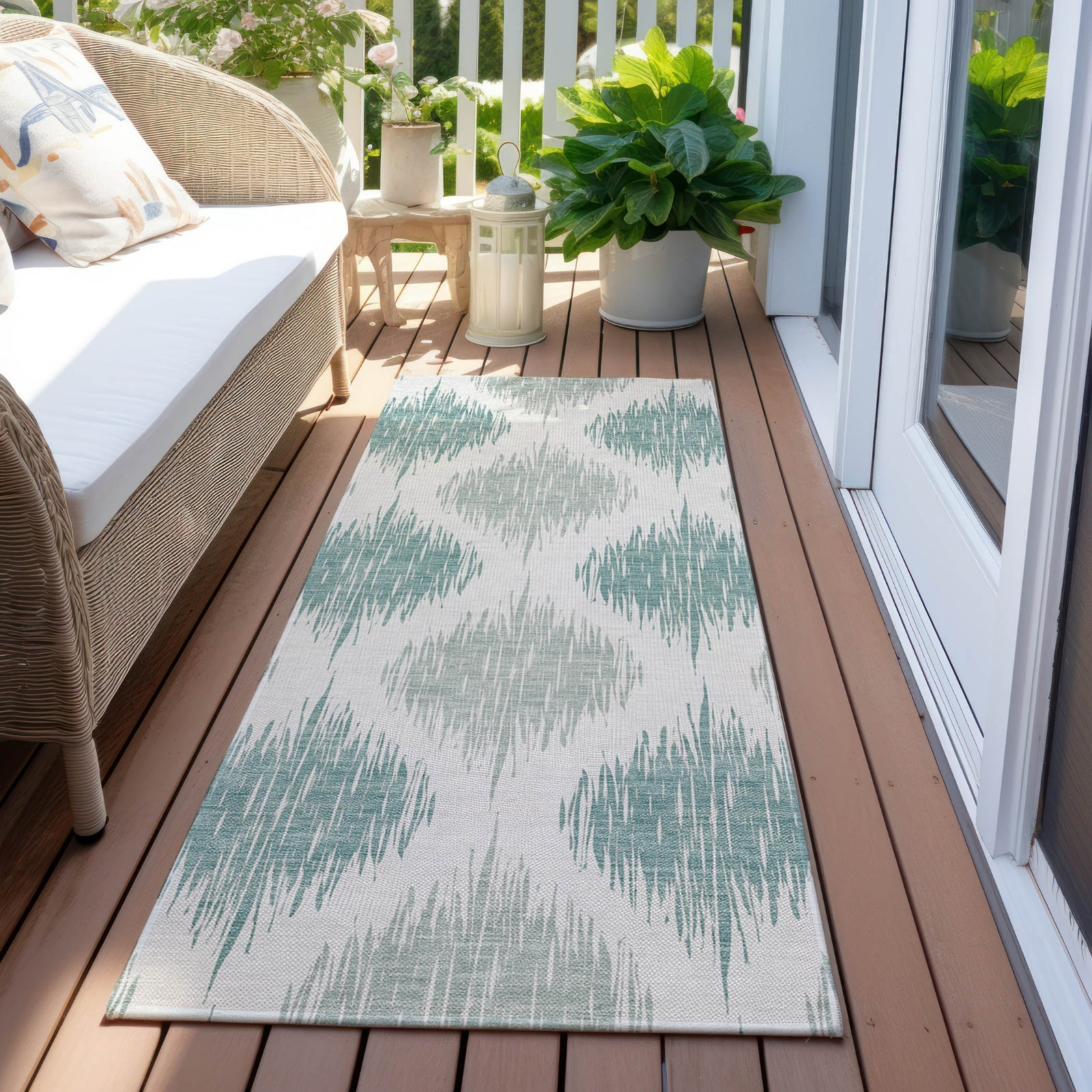 Witness the fusion of traditional and modern in our area rug, highlighted by a blurred ikat pattern that results in a stunning lattice effect. This transitional piece reinvents the classic ikat style. Built for endurance with UV stabilization, ultra-thin for various placements, and machine-washable, this rug is a practical and stylish addition to homes with pets and children.