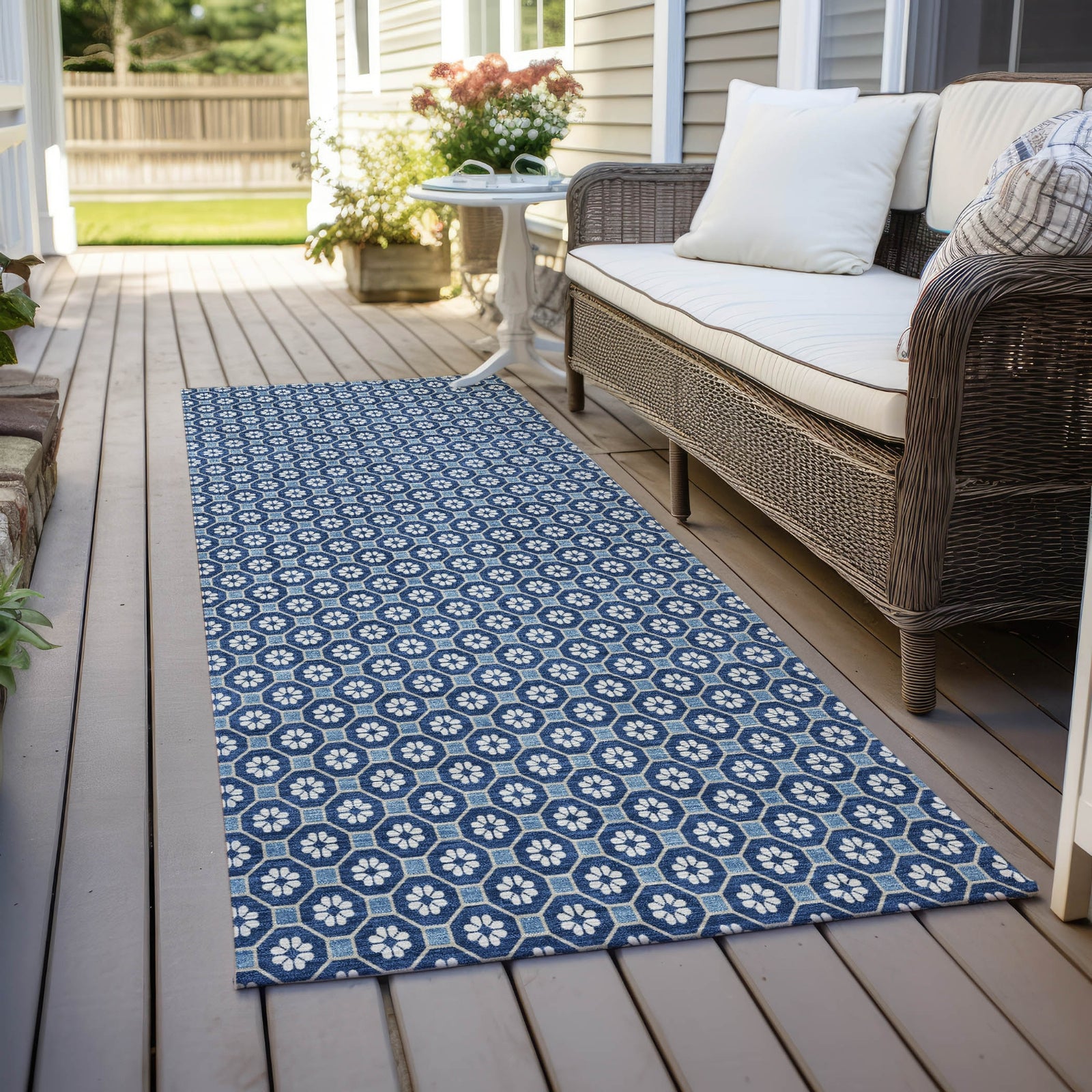 Experience the elegance of a small lattice pattern with floral petals in this transitional rug. The lattice pattern adds a sophisticated and artistic touch to your decor. UV stabilized for both indoor and outdoor use, it features an ultra-thin construction. This machine-washable rug is family and pet-friendly, ensuring easy maintenance and long-lasting charm.