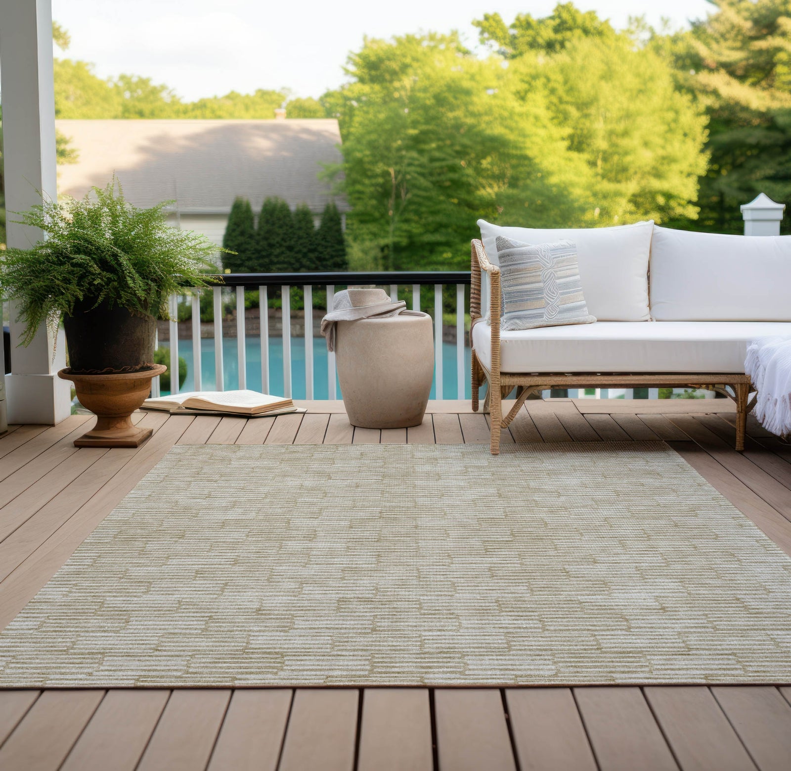 Elevate your decor with this area rug, showcasing small rectangles that merge to present a horizontal image, reflecting a transitional style with linear details. This rug is designed for every setting, UV stabilized for indoor and outdoor use. Its ultra-thin construction and machine-washable feature make it a practical and stylish choice for any family or pet-friendly household.