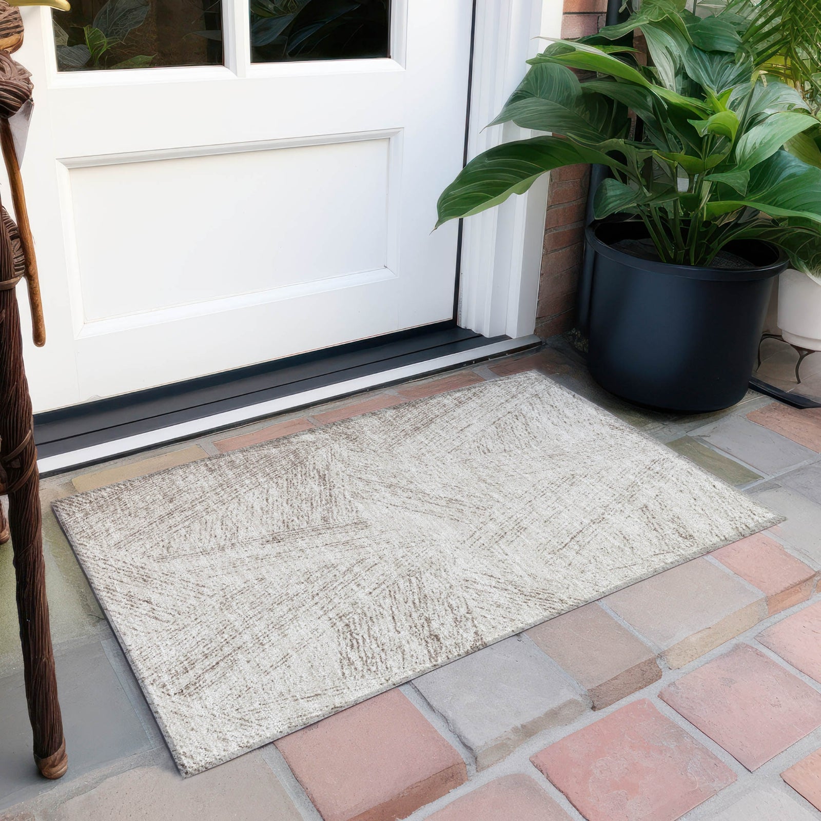 Redefine your space with our area rug that features a mesmerizing pattern of small, multi-directional lines, offering a transitional and versatile look. Its UV stabilization protects against the suns rays, the ultra-thin construction promises easy placement, and being machine-washable makes it an invaluable asset in a home that values both pets and cleanliness.