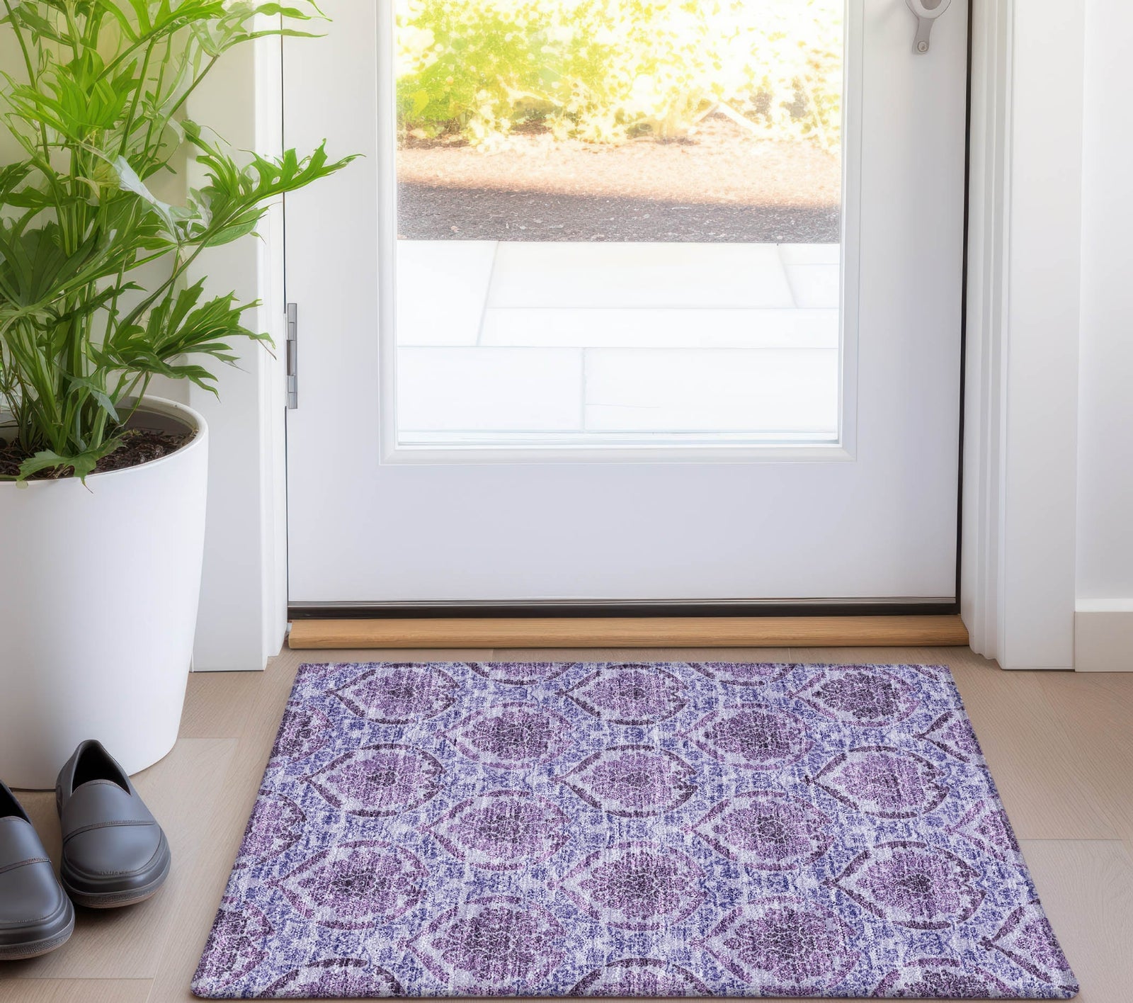 Bring a touch of sophistication to your home with our area rug, enriched with horizontally lined medallions, each detailed in a transitional fashion. These medallions offer a timeless aesthetic. The rug is UV stabilized for any space, ultra-thin for simple placement, machine-washable for effortless cleaning, and perfect for family and pet-friendly homes.