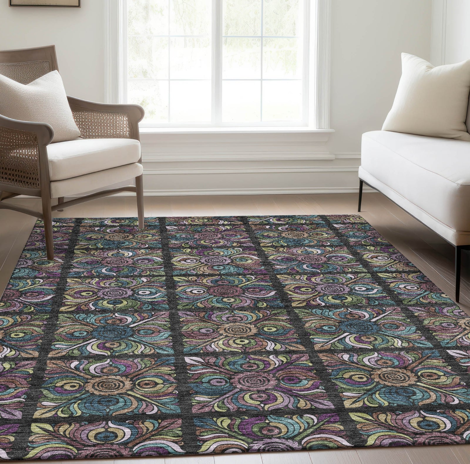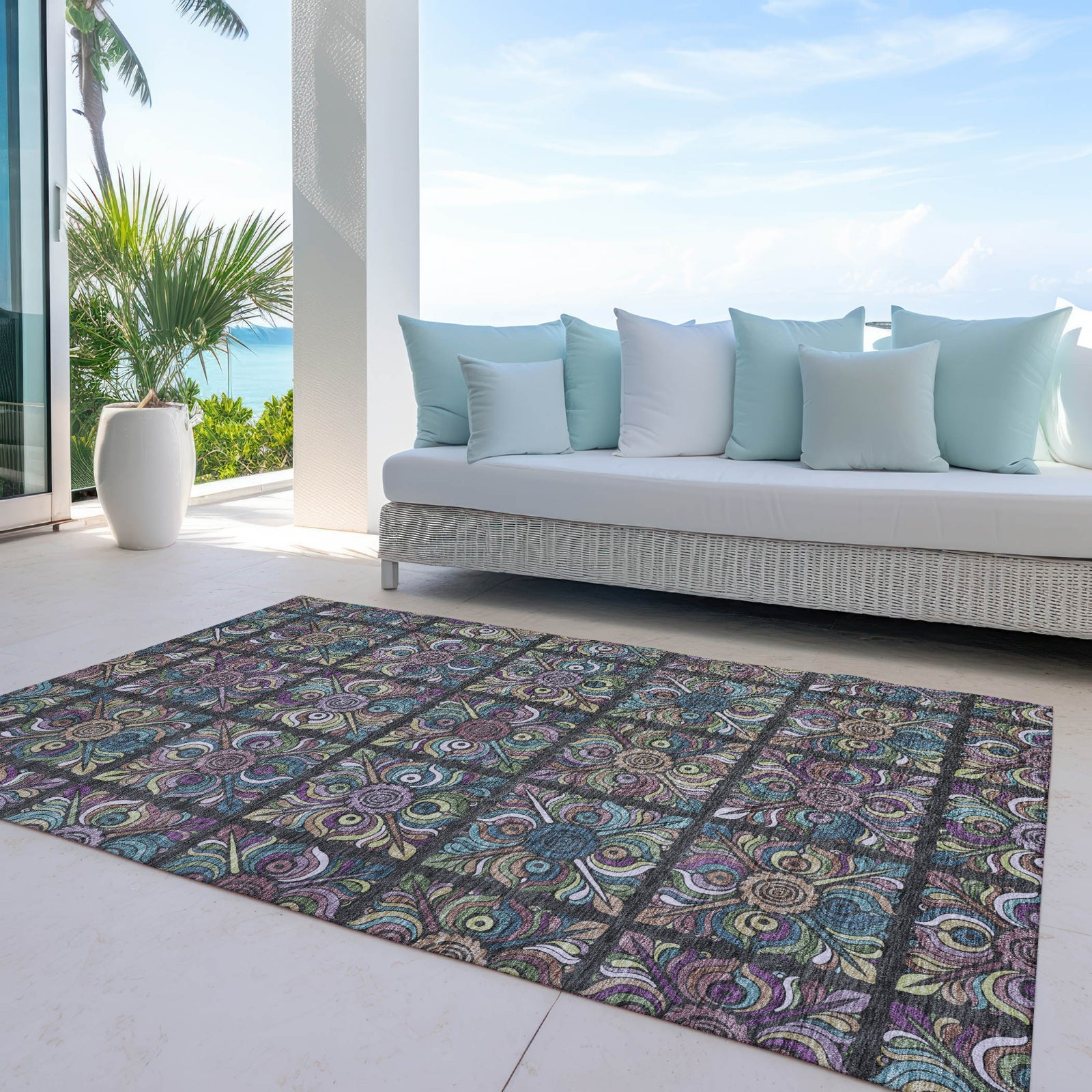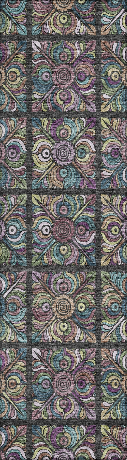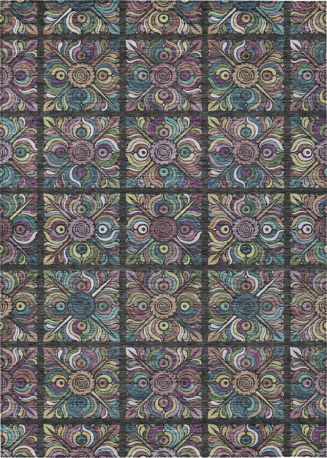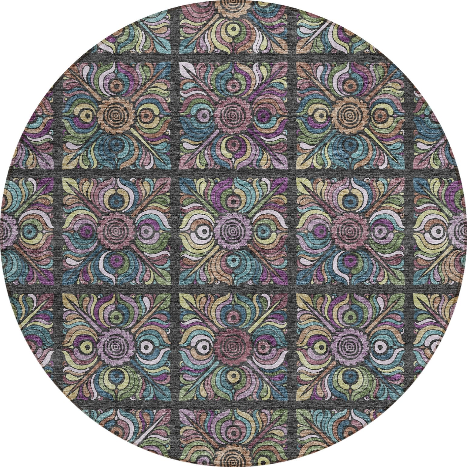 Elevate your decor with our sophisticated area rug, where stained glass squares in a checkered board pattern are artfully paired with transitional medallions. The intricate pattern is visually striking and adds a contemporary flair. Designed for adaptability, it's UV stabilized, ultra-thin for easy integration into any space, and machine-washable, making it a superb choice for families and pet owners.