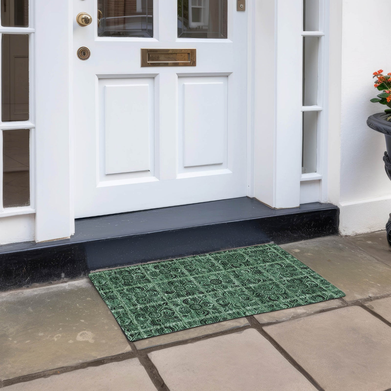 Create a statement in your space with our area rug, where stained glass squares are artfully arranged in a checkered board style, enhanced with transitional medallions. The pattern is visually striking and adds a contemporary flair. Designed for adaptability, it's UV stabilized for different environments, ultra-thin for easy integration, and machine-washable, making it a superb choice for family and pet-friendly homes.