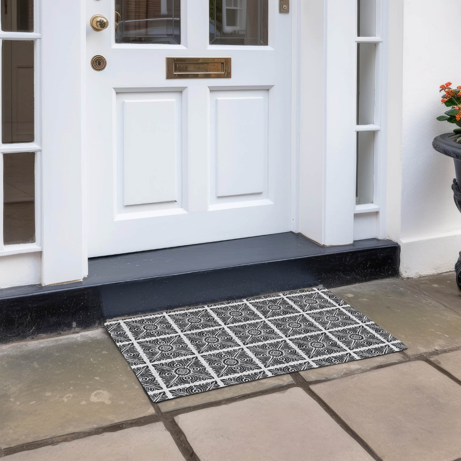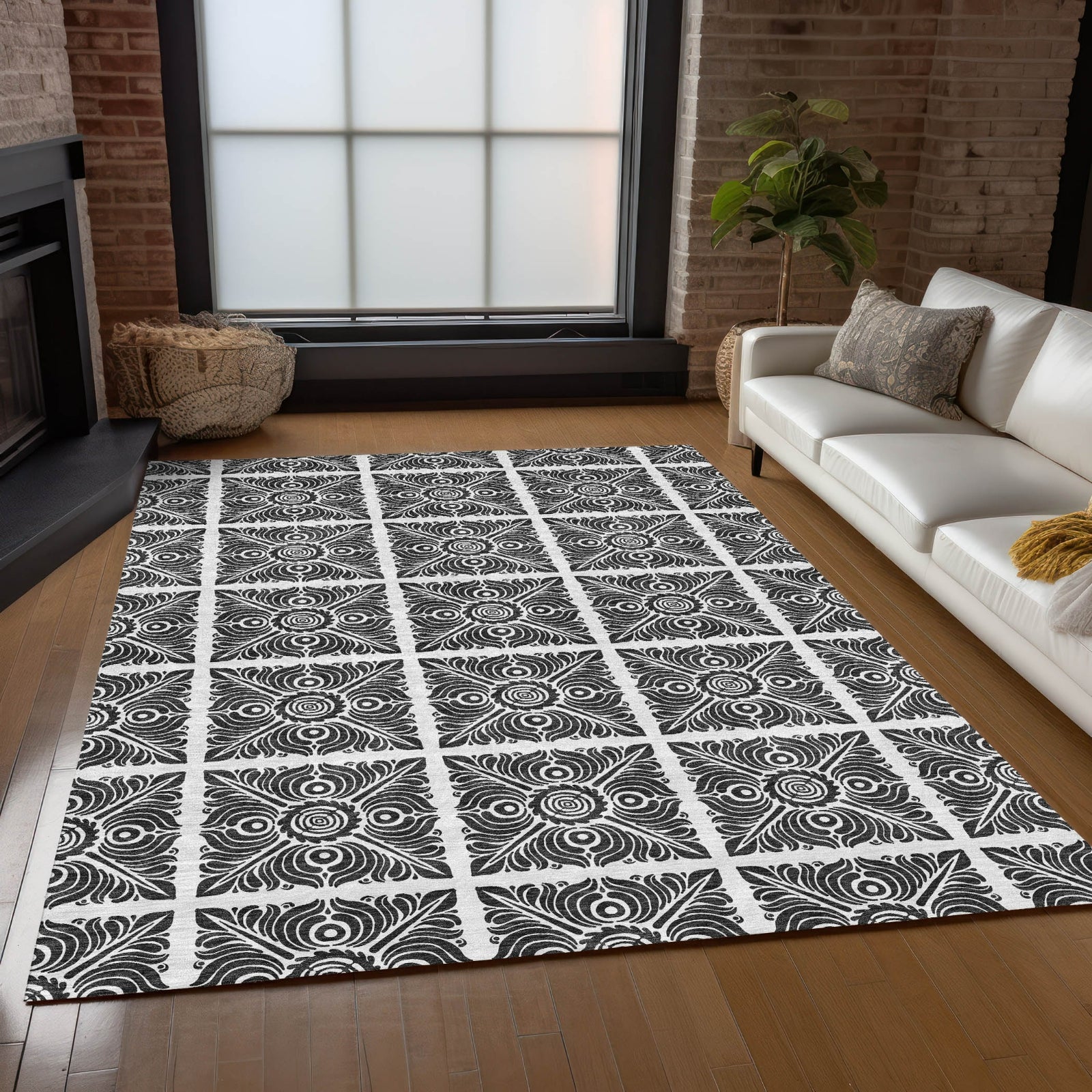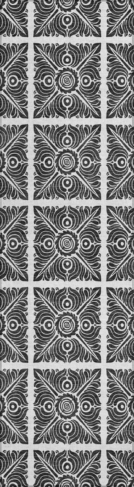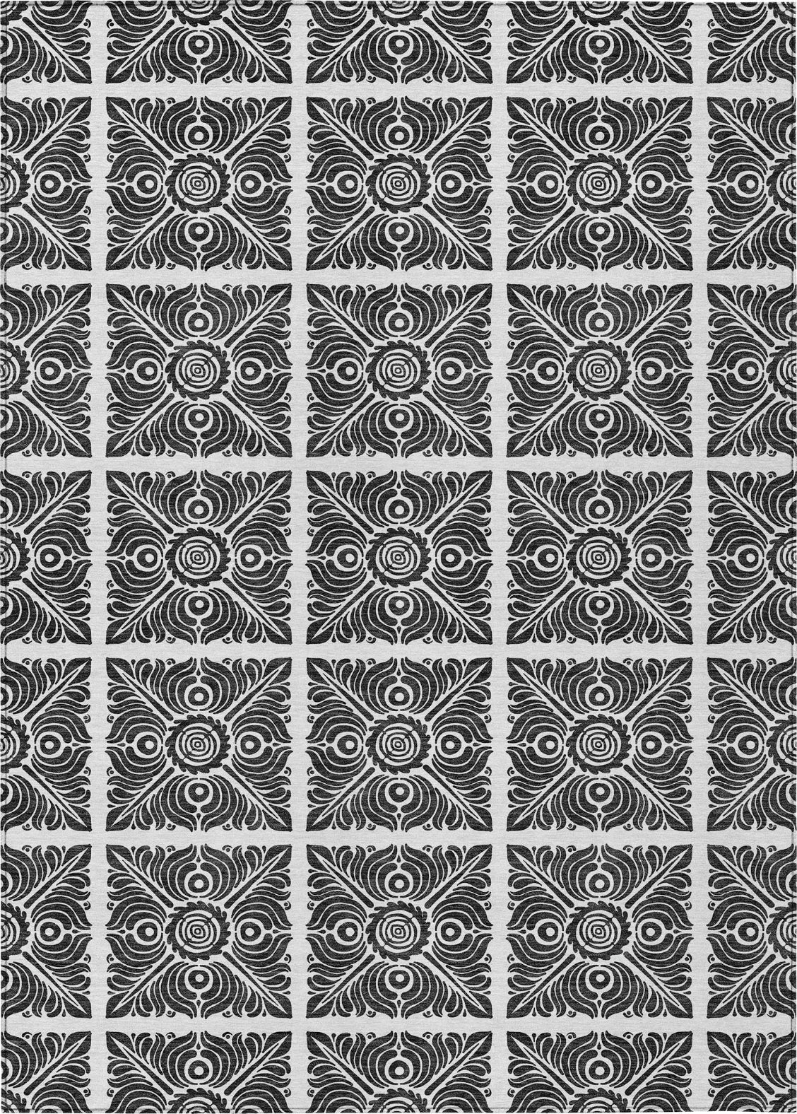 Create a statement in your space with our area rug, where stained glass squares are artfully arranged in a checkered board style, enhanced with transitional medallions. The pattern is visually striking and adds a contemporary flair. Designed for adaptability, it's UV stabilized for different environments, ultra-thin for easy integration, and machine-washable, making it a superb choice for family and pet-friendly homes.