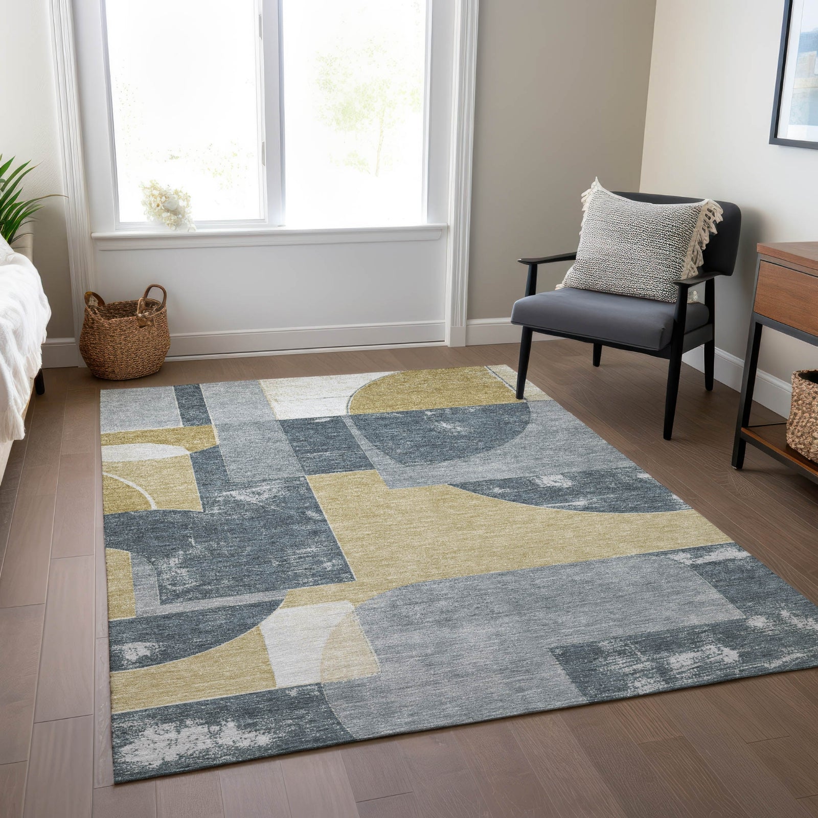 This transitional rug showcases modern shapes to create a mid-century appeal, offering a pattern that enhances any room with retro sophistication. The geometric design introduces a classic yet contemporary style, blending seamlessly with various decor themes. UV stabilized for enduring color, this rug remains vibrant indoors or outdoors. Its ultra-thin profile allows it to fit under furniture with ease, and it is machine-washable for easy maintenance. Ideal for homes with children and pets, this rug merges mid-century design with functional benefits.