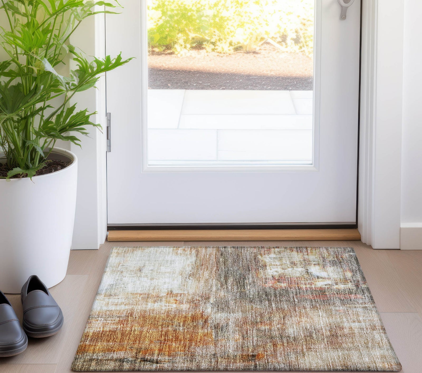 Add a touch of modern sophistication to your space with our transitional area rug, featuring a unique blend of textured motifs. This rug effortlessly straddles the line between modern and transitional design, enhancing any room. With UV stabilization, it's perfect for any setting, indoors or out. The ultra-thin profile and machine-washable fabric make it a practical choice for active homes, and it's designed to be both family and pet friendly.