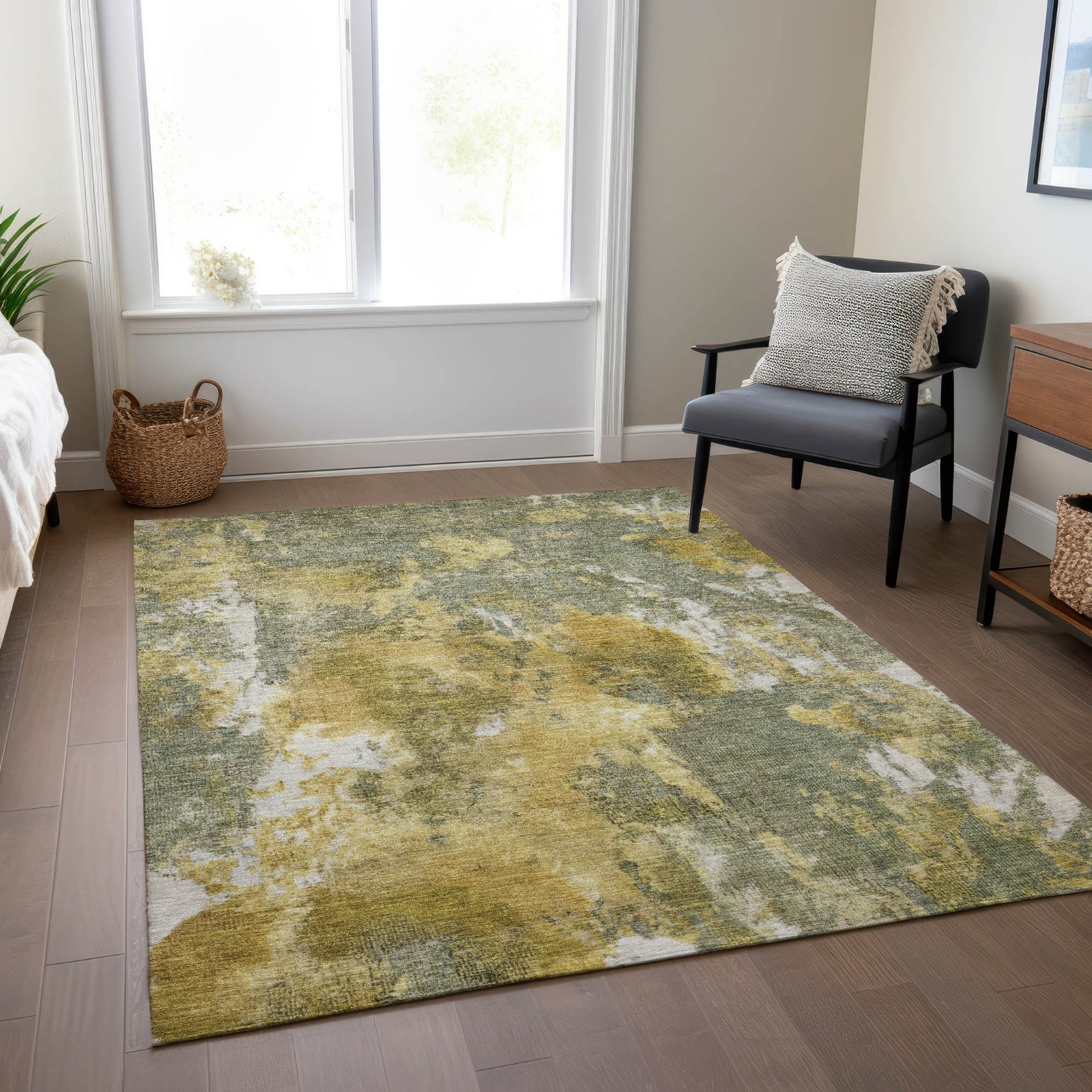 With its subtle color transitions, this rug resembles a modern work of art, bringing a calm yet striking visual effect to the room. The gentle blending of shades adds depth and movement, making it a beautiful focal point. The transitional style and modern pattern make it versatile for any decor style. This UV-stabilized rug is designed for both indoor and outdoor use, with an ultra-thin construction that makes it easy to manage and maintain. Machine-washable for convenience, it's also family and pet-friendly, ensuring it holds up to daily traffic and activity. Bring effortless style and durability to your space with this versatile rug.
