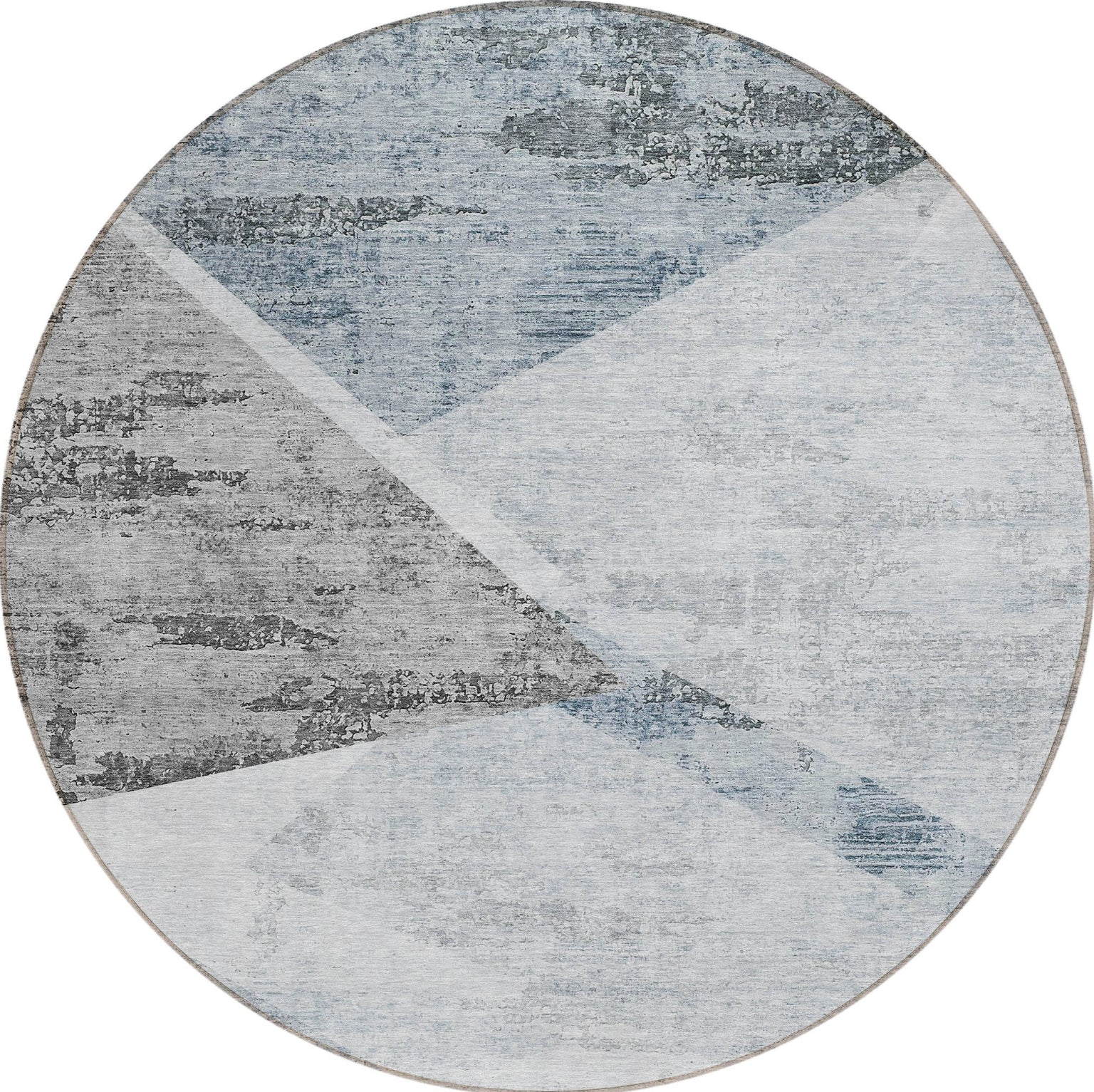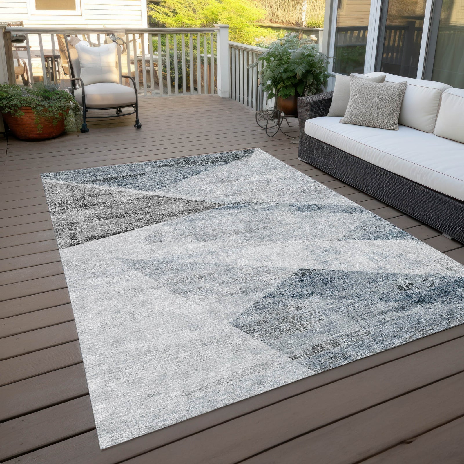 This rug's modern angular shapes create a dynamic center focal point, embodying the essence of transitional and contemporary style. The pattern is both eye-catching and sophisticated, making it a standout piece in any modern interior. It's UV stabilized for flexibility, ultra-thin for a modern aesthetic, machine-washable for practicality, and suitable for homes with pets and kids.
