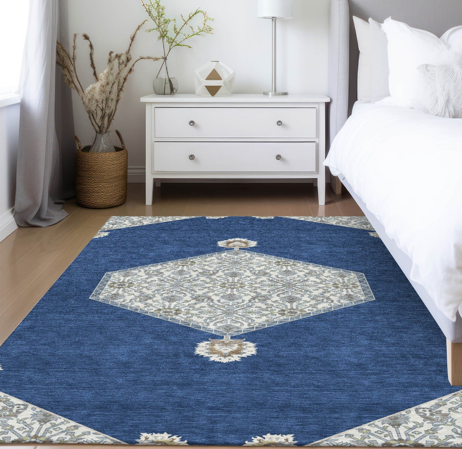 Step into luxury with our area rug, which features a central medallion design on a clear open field, offering a traditional oriental look with a clean finish. Perfect for those who appreciate understated elegance, this rug is UV stabilized, ultra-thin, and machine-washable, making it a convenient choice for homes where pets and children are a priority.
