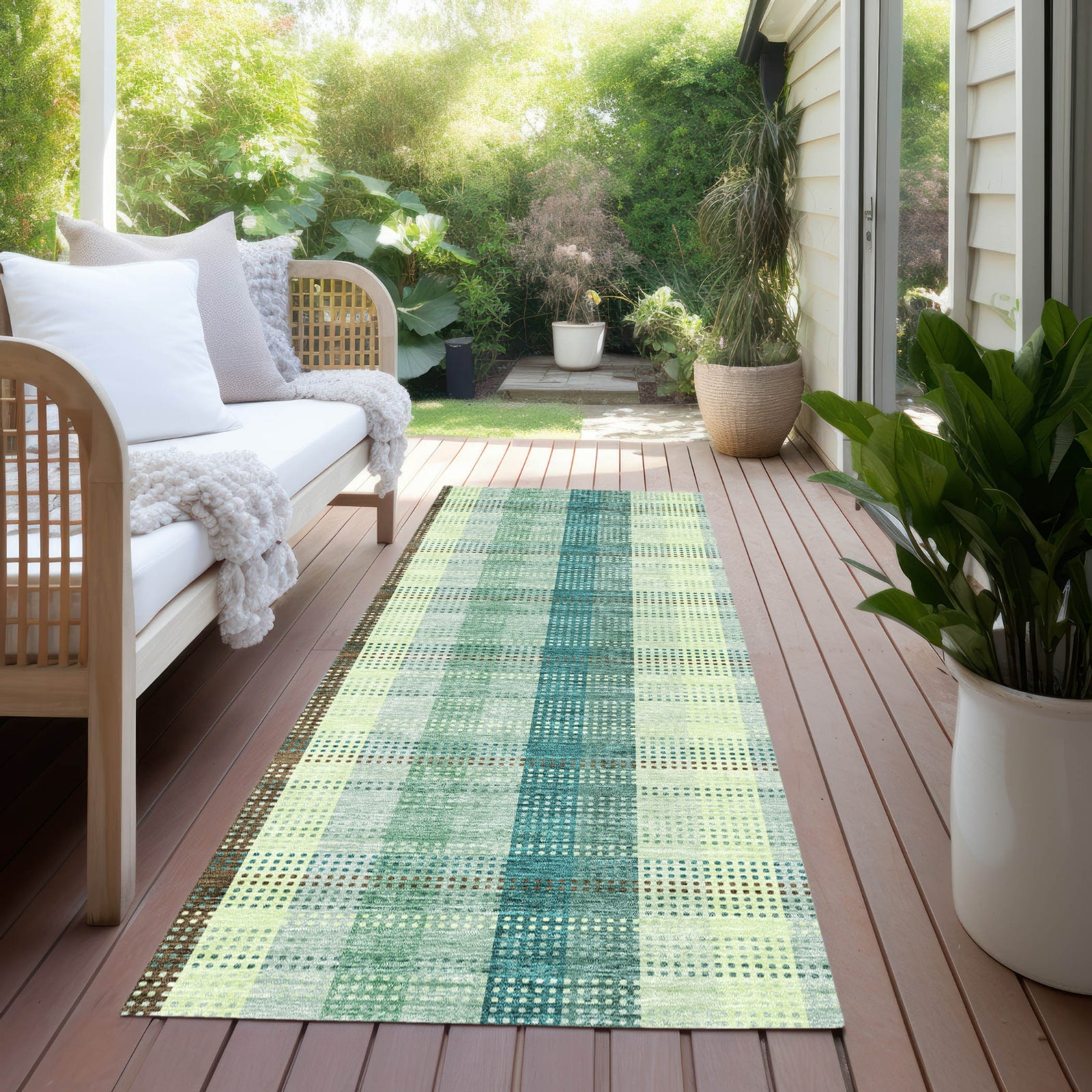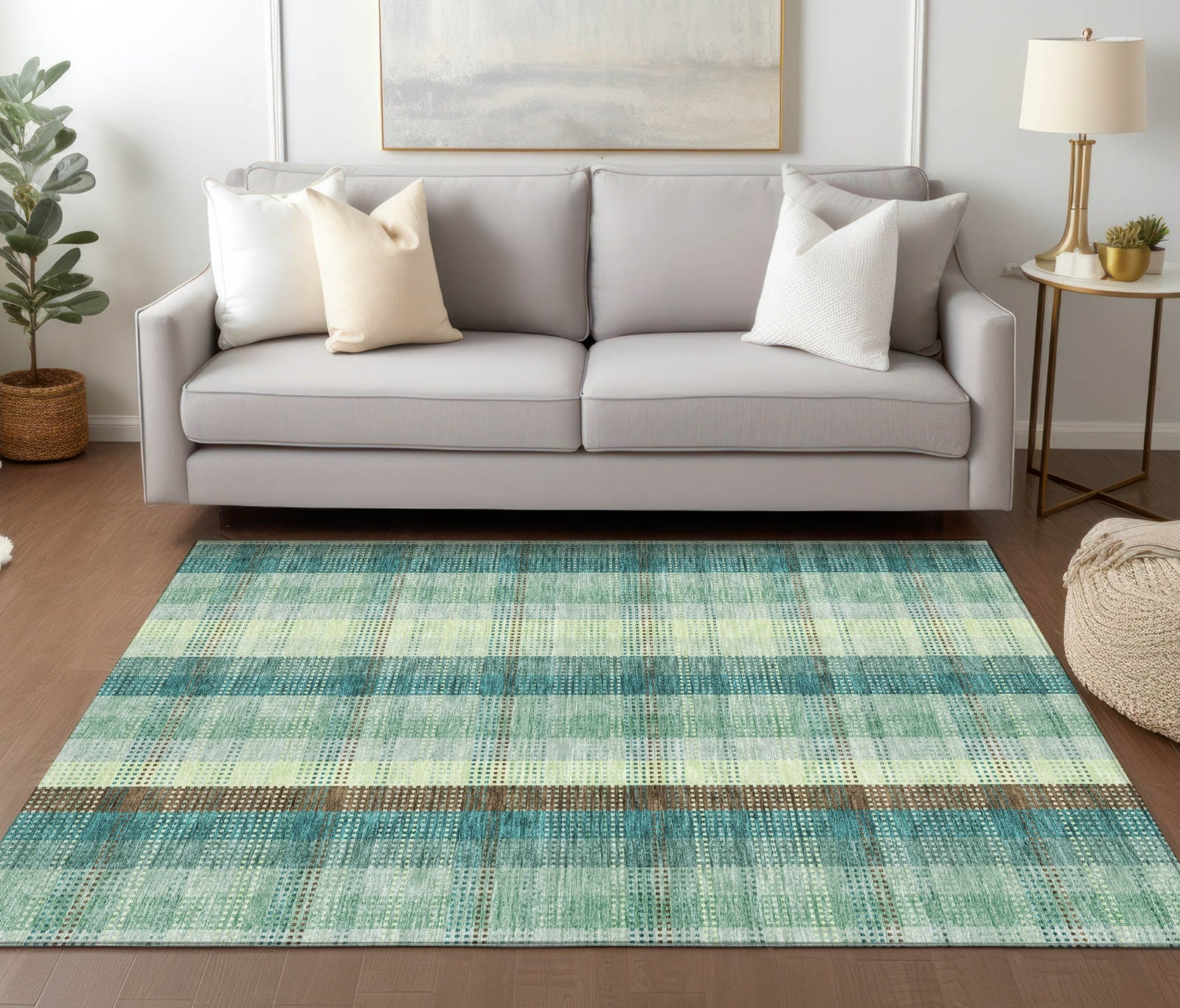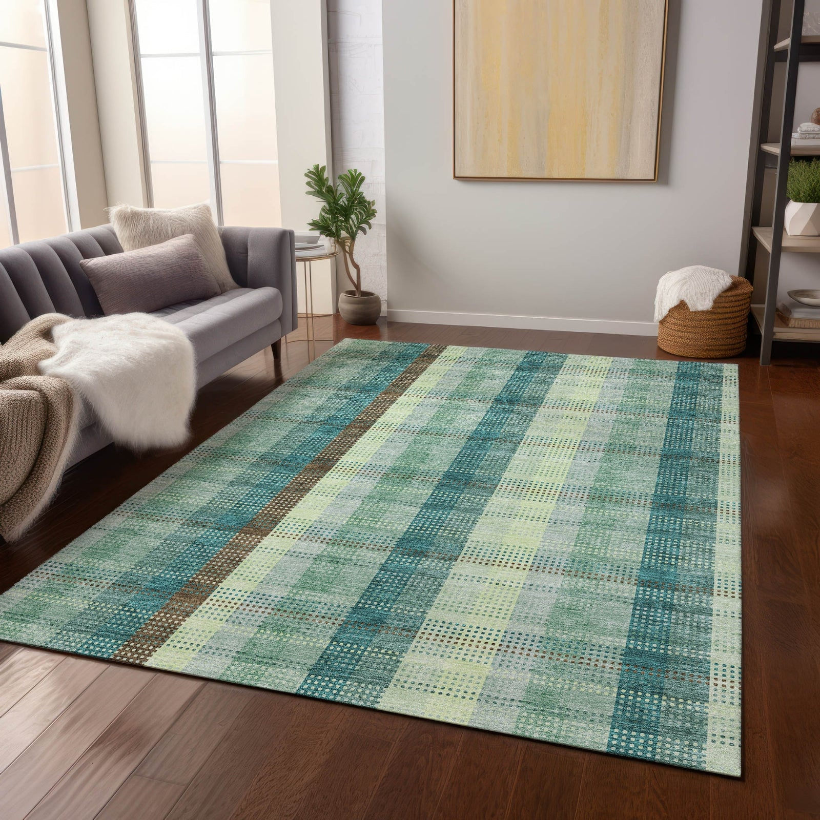 Infuse your home with our plaid area rug, where a precise grid of lines creates a transitional design, marrying classic style with modern sensibilities. It's UV stabilized for multipurpose use, ultra-thin for subtle elegance, and machine-washable, making it an indispensable addition to any family-friendly, pet-loving household.