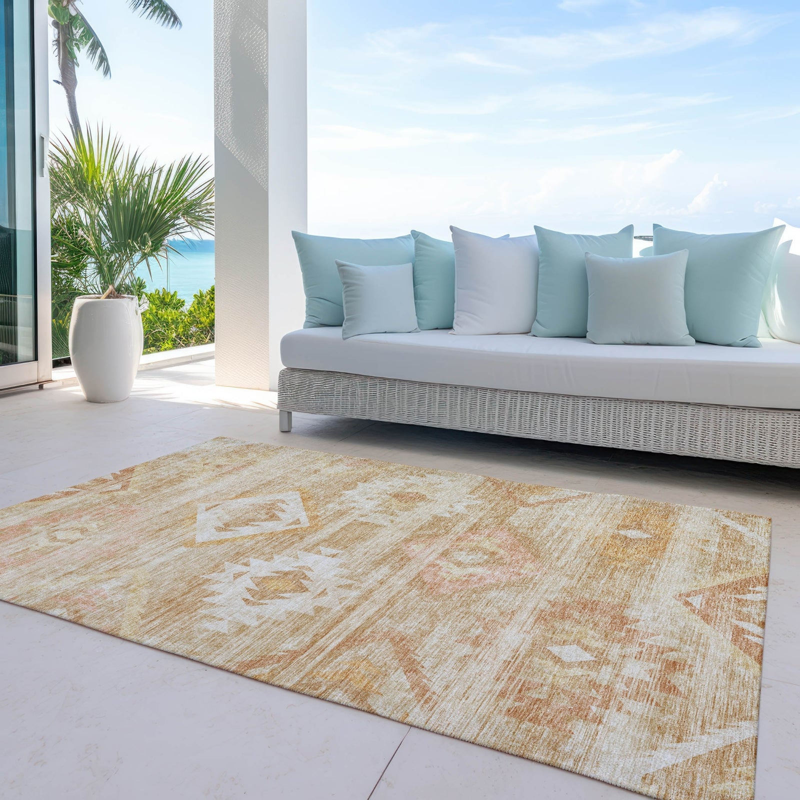Revel in the beauty of our area rug, which showcases a Southwest tribal pattern on a large scale, embodying the spirit of transitional decor with a southwest twist. The design is both impactful and adaptable to various settings. It's UV stabilized to endure different environments, and its ultra-thin construction makes it a versatile fit for any area. The machine-washable feature adds to its appeal as a family and pet-friendly rug, offering both elegance and ease of care.