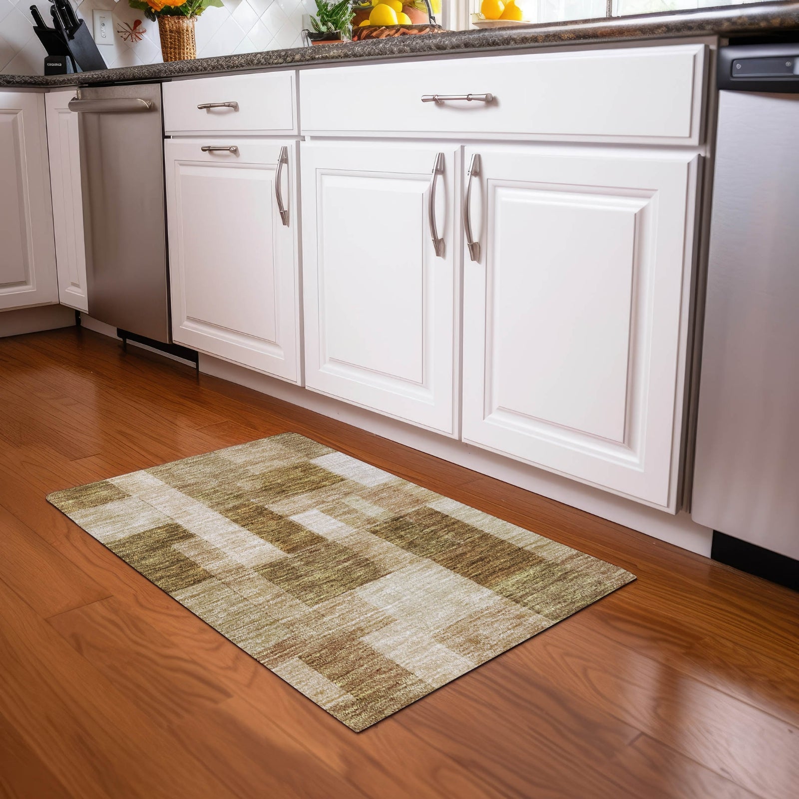 Our area rug, adorned with a variety of squares in a soft color palette, brings a refined touch to modern and transitional styles. It's UV stabilized for durability in any environment and boasts ultra-thin construction for easy placement. Additionally, it's machine-washable, making it an excellent choice for busy households with pets and children.