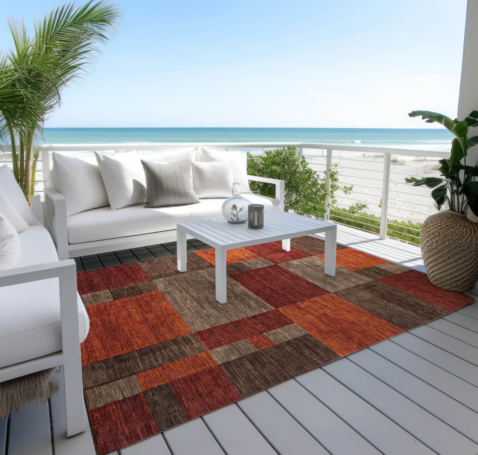 The random-shaped squares on this rug, set against a textured stria field, create a bold yet balanced design that adds visual interest to any room. The stria texture introduces a soft, layered feel that enhances the overall pattern. With its transitional style, this rug seamlessly fits into both contemporary and classic interiors. This UV-stabilized rug is designed for both indoor and outdoor use, with an ultra-thin construction that makes it easy to manage and maintain. Machine-washable for convenience, it's also family and pet-friendly, ensuring it holds up to daily traffic and activity. Bring effortless style and durability to your space with this versatile rug.