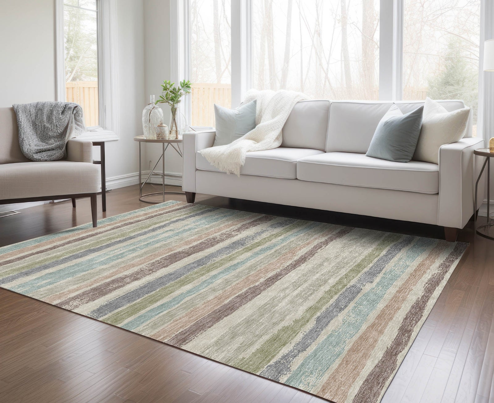 Transform your room with our area rug, which features naturally drawn stripes for a truly cozy and transitional look. The soothing stripes infuse warmth and comfort into any space, harmonizing with both modern and traditional designs. UV stabilized for enduring beauty indoors and outdoors, this rug's ultra-thin construction ensures it fits easily anywhere. It's machine-washable, making it both family and pet friendly-a practical addition to any busy household.