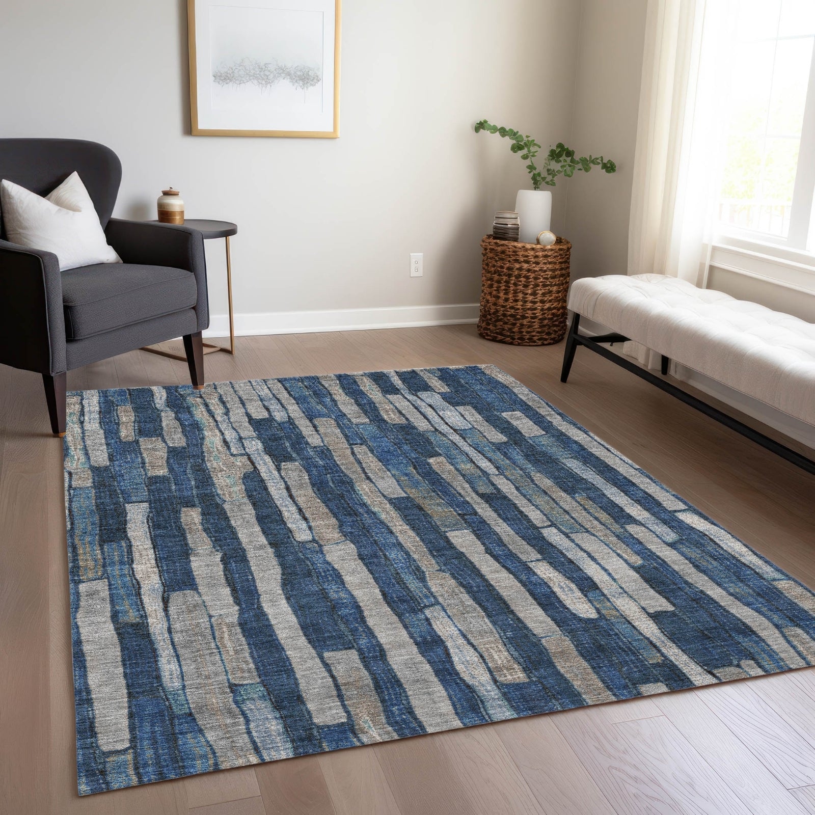 The stripe pattern created by horizontal line bars adds a contemporary touch to this rug, ideal for transitional interiors. The design provides a sophisticated look, making it a versatile choice for various decors. UV-stabilized fibers ensure it is suitable for both indoor and outdoor use. The ultra-thin build allows for easy placement and maintenance, and it is machine-washable for simple care. Perfect for families and pet-friendly environments, this rug seamlessly combines elegance with practicality.