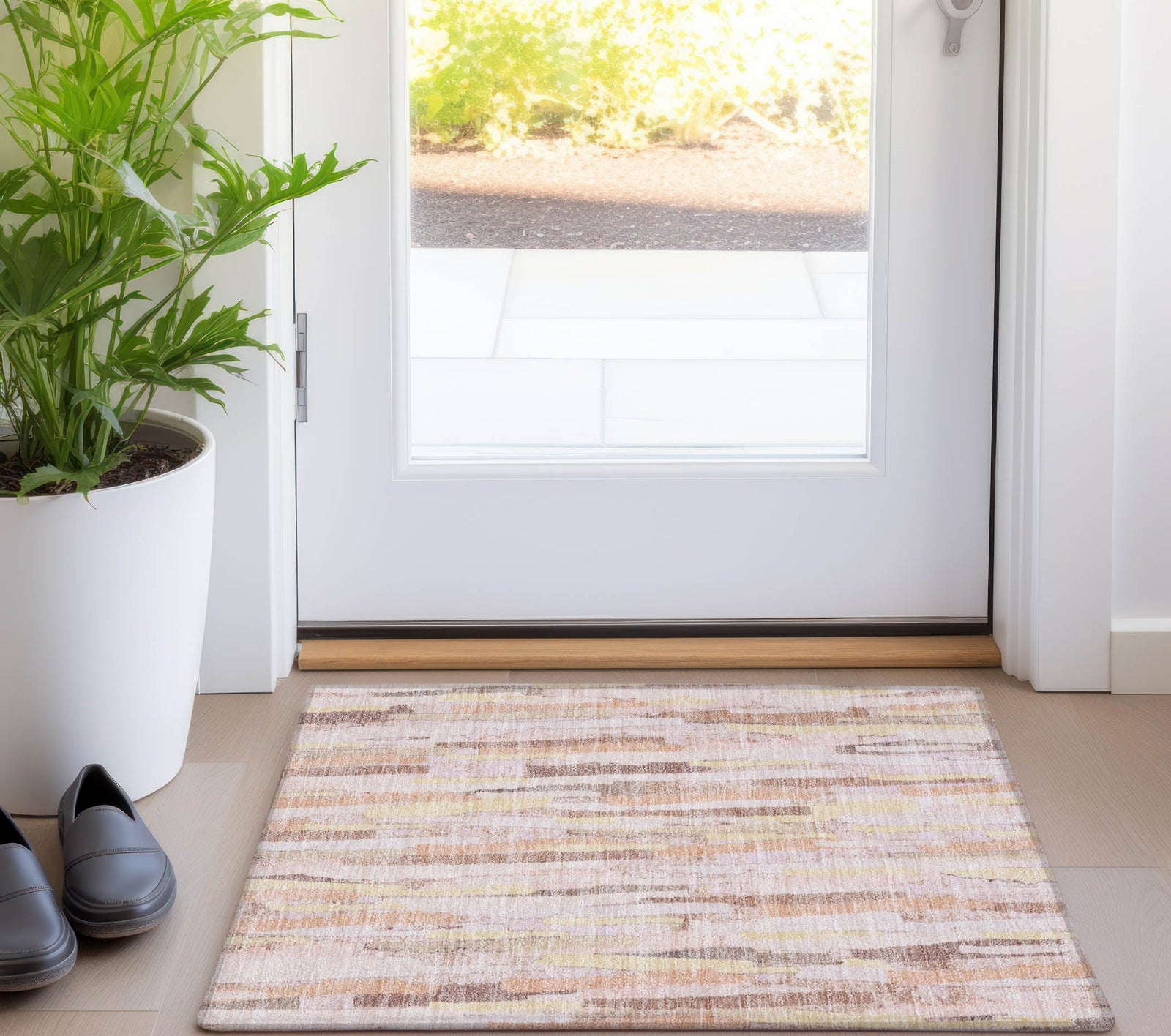 The hand-drawn appearance of horizontal bars creates a stripe pattern that enhances transitional interiors with casual sophistication. The unique design adds depth and elegance, making it a versatile choice for various decors. UV-stabilized fibers ensure it is ideal for both indoor and outdoor use. The ultra-thin build allows for easy placement and maintenance, and it is machine-washable for simple care. Perfect for families and pet-friendly environments, this rug seamlessly combines elegance with functionality.