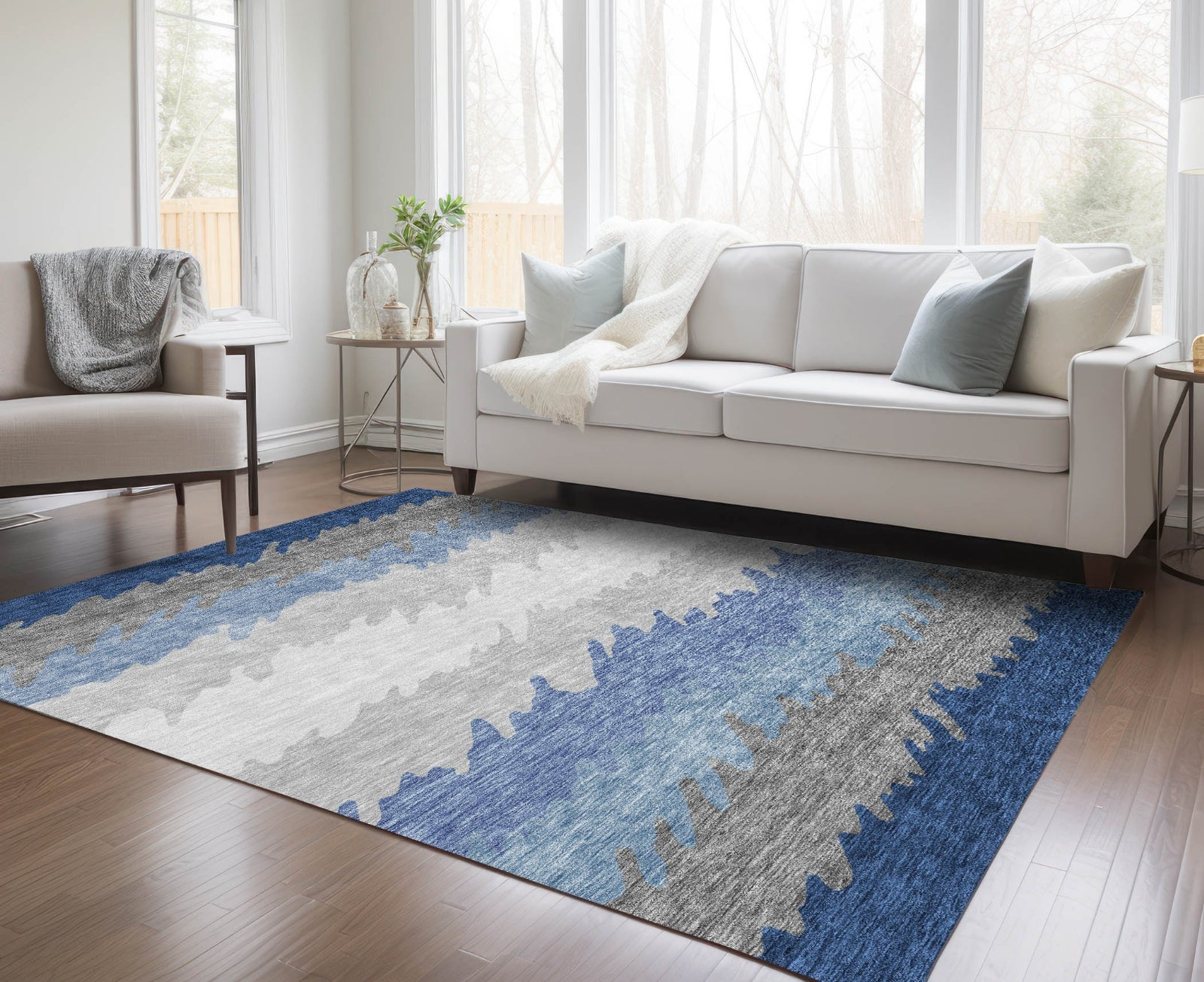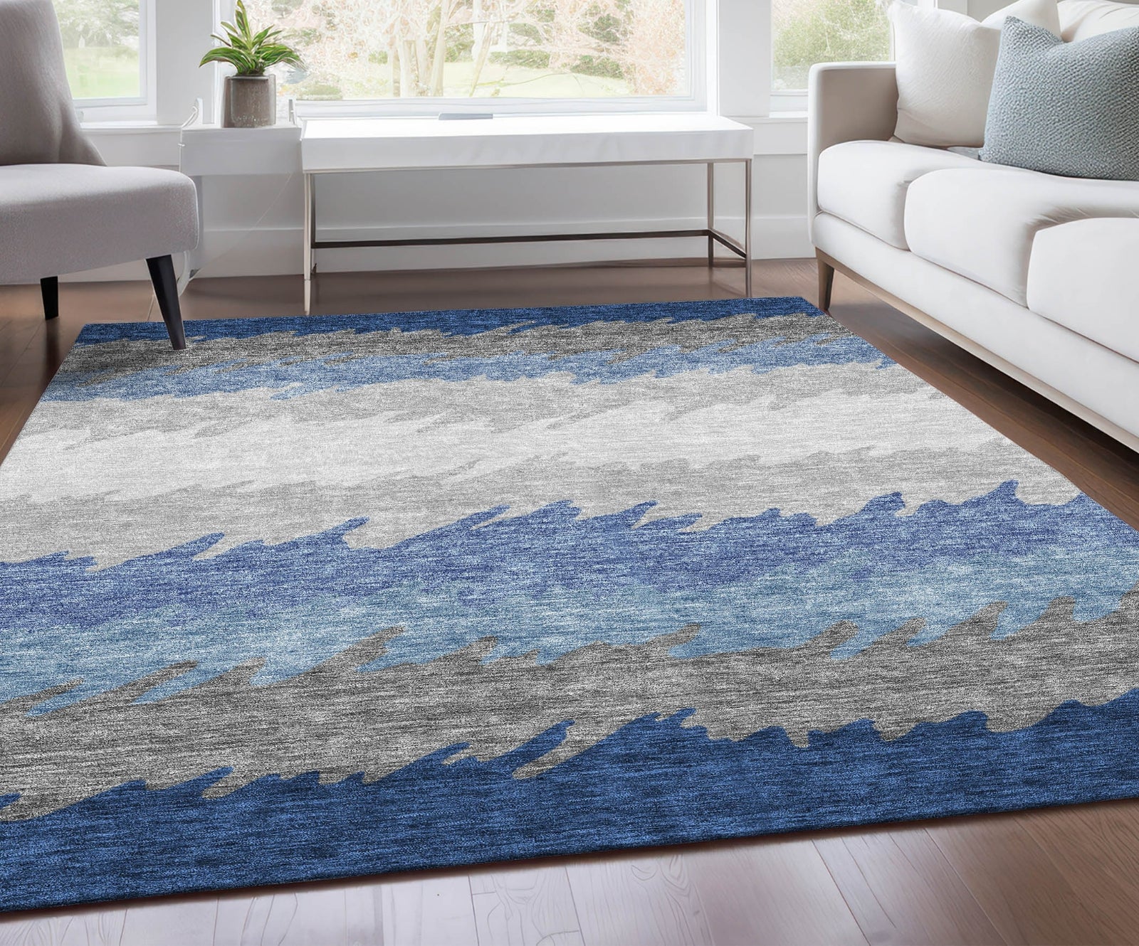Step into a world of contemporary elegance with our transitional rug, featuring large irregular horizontal stripes. The striking pattern is a blend of modern design and timeless charm, ideal for any decor. It's UV stabilized for both indoor and outdoor use, ultra-thin for contemporary styling, machine-washable for your convenience, and family and pet-friendly, making it a must-have for modern living.