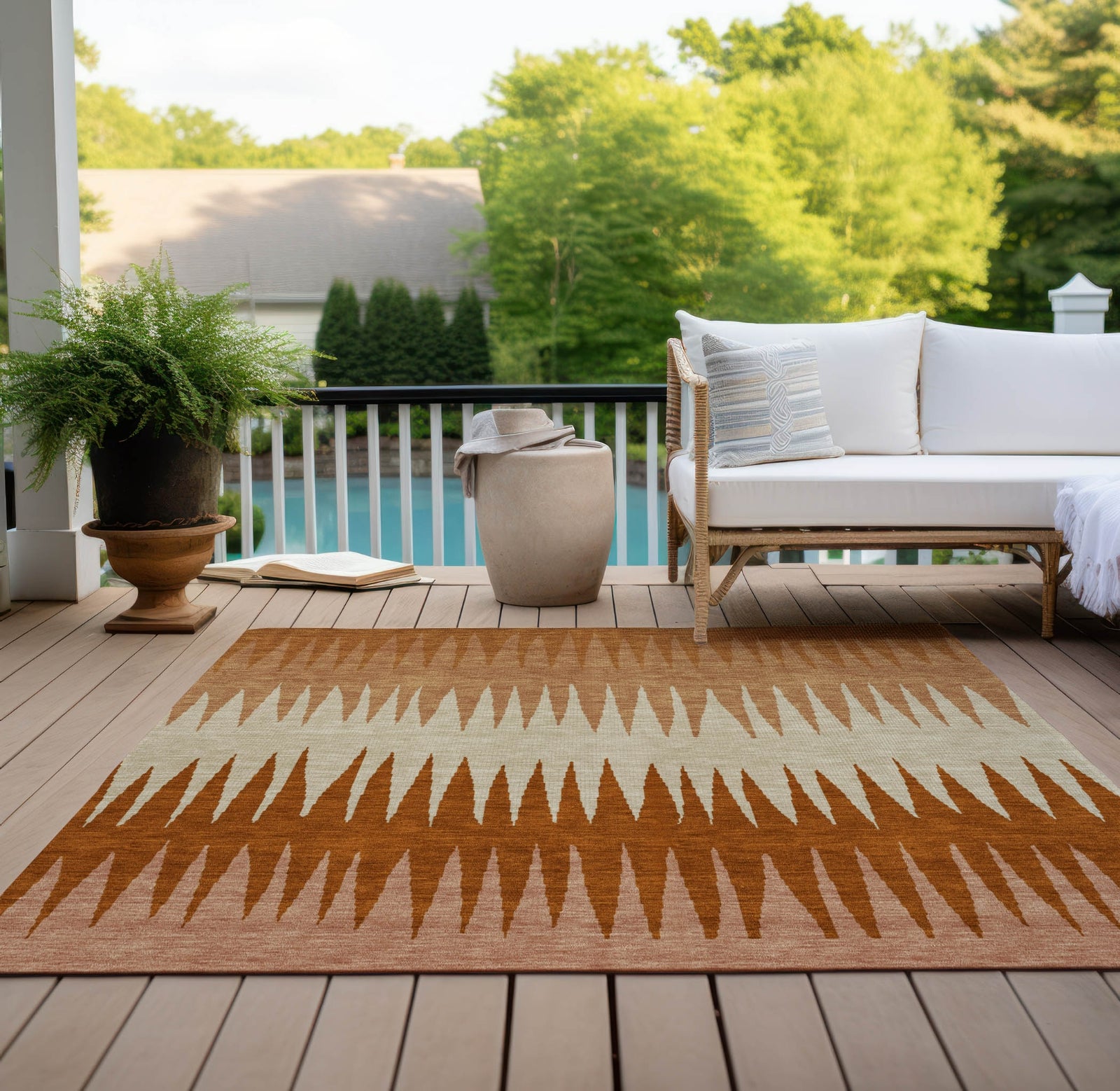 Discover the allure of our area rug, where large zig-zag lines weave a captivating flame stitch pattern, perfectly complemented by transitional stripes. Crafted to excel in both indoor and outdoor environments, thanks to its UV-stabilized material, this rug offers unparalleled flexibility. Its ultra-thin profile allows for seamless placement, and the fact that it's machine-washable makes it a favorite among families and pet owners. Elevate your home with this fusion of fashion and function.