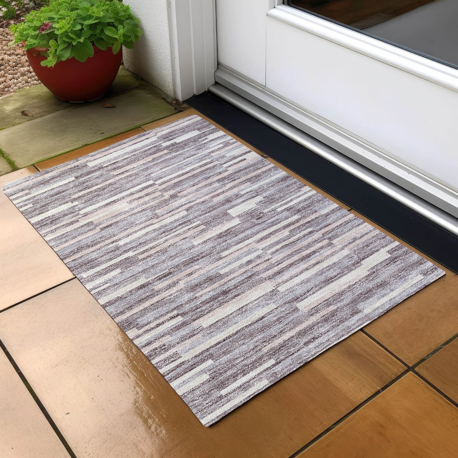 Step into the world of contemporary elegance with our area rug, featuring vertical bars in random widths that create a captivating transitional stripe pattern. This design is a perfect match for both classic and modern interiors, offering a fresh perspective. UV stabilized for use in any setting, its ultra-thin construction makes it a convenient choice, and being machine-washable and family and pet-friendly, it's an ideal addition to a lively, stylish household.