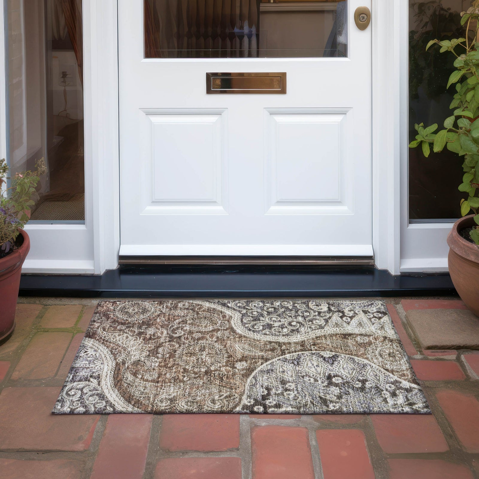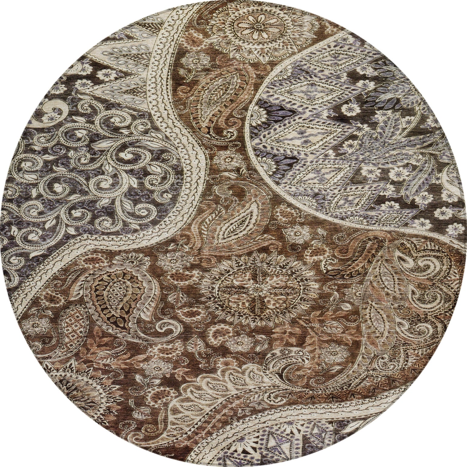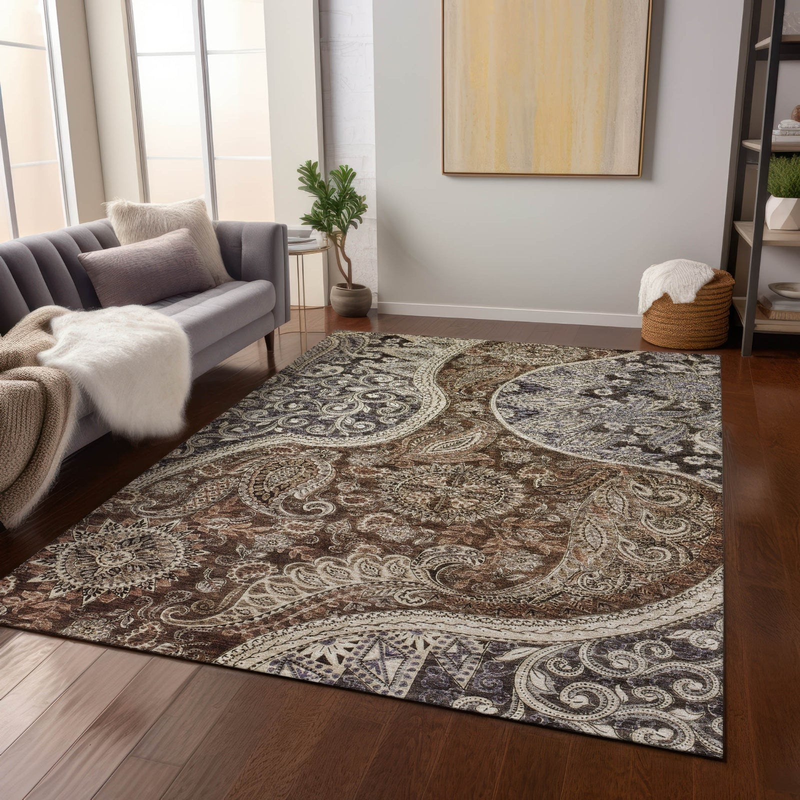Adorn your floors with our transitional area rug, centered with a prominent swirl and intricate motifs that draw the eye. Perfect for any indoor or outdoor setting thanks to its UV stabilization, this rug also boasts an ultra-thin design and is machine-washable. It's designed to be both family and pet-friendly, ensuring it meets the demands of a modern home.