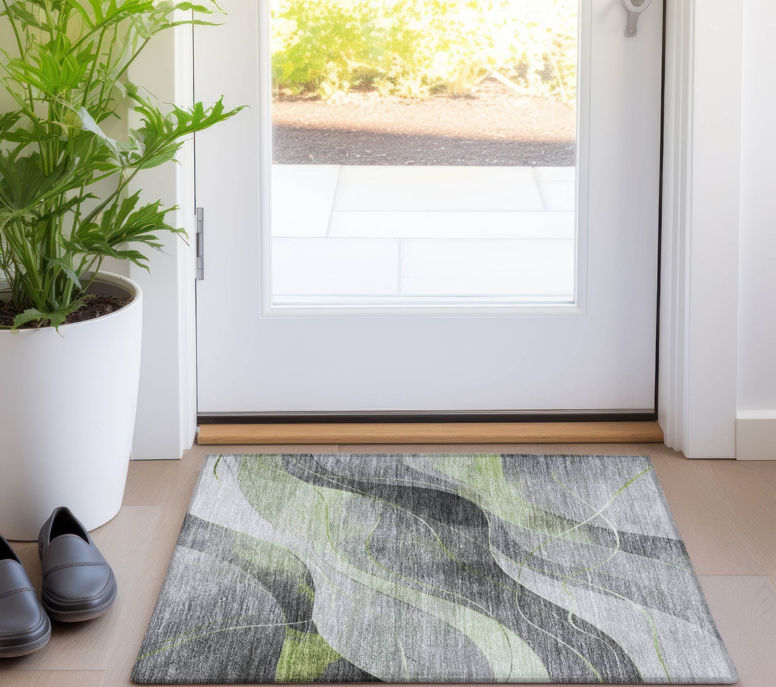 Waves of intricate swirls paired with small thin lines define the design of this transitional rug. The sophisticated pattern adds a touch of elegance and modern flair to your decor. UV stabilized for durability, this rug is ideal for both indoor and outdoor use, maintaining its striking appearance through regular wear. Its ultra-thin profile fits effortlessly under furniture, and it's machine-washable for hassle-free care. Perfect for family and pet-friendly spaces, this rug blends style with practical functionality.