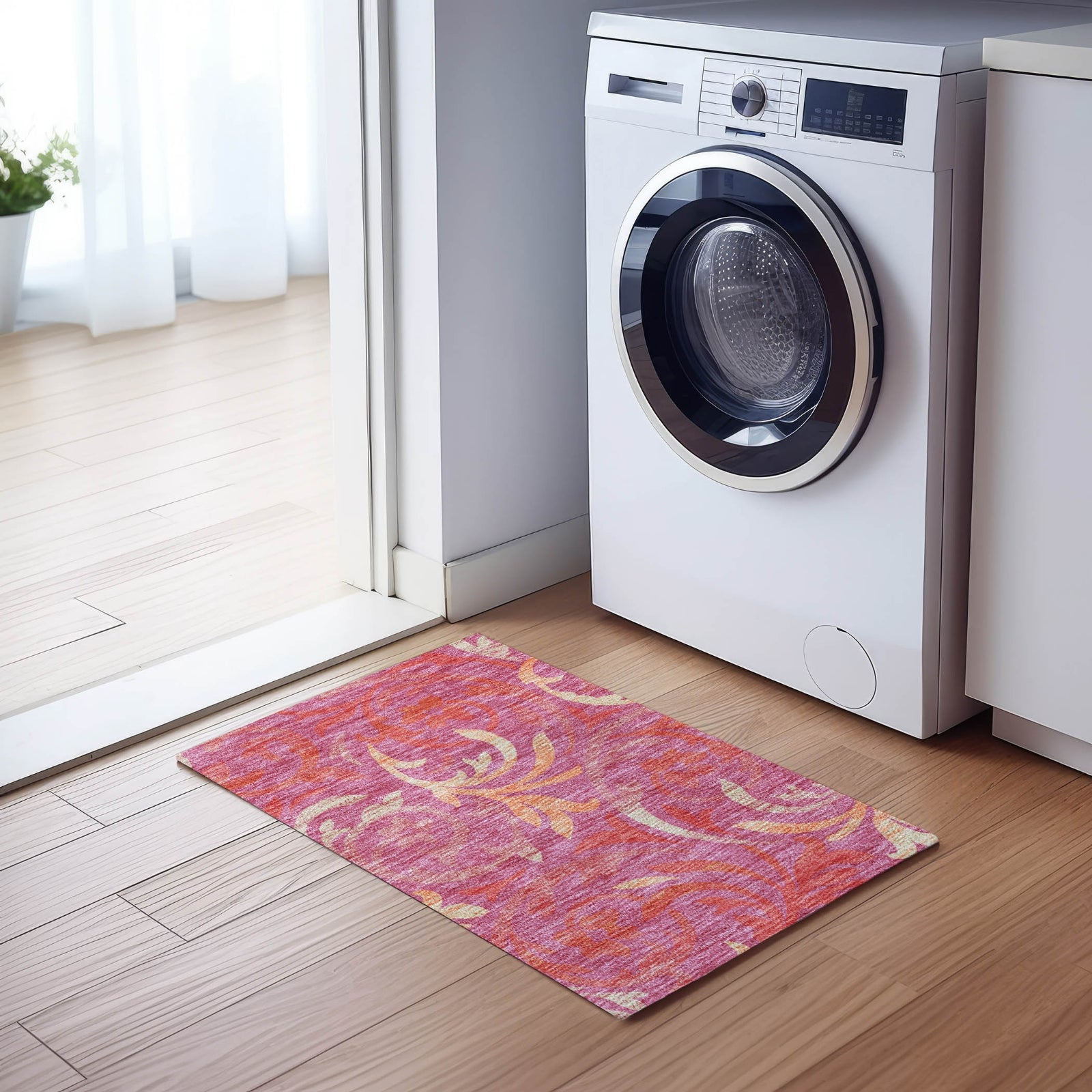 The elegant swirls of delicate vines on this rug create a mesmerizing pattern, ideal for adding a transitional touch to your decor. These vine swirls offer a perfect combination of elegance and calmness, enriching any living area with style. UV stabilized, ultra-thin, machine-washable, and family and pet-friendly, it's a practical yet sophisticated choice for contemporary living.