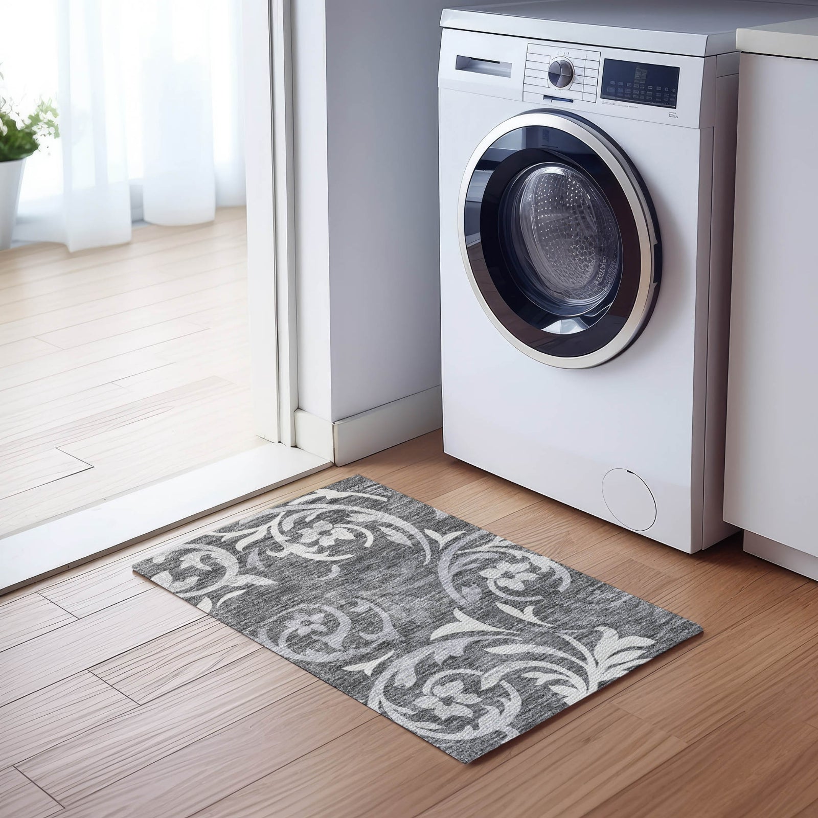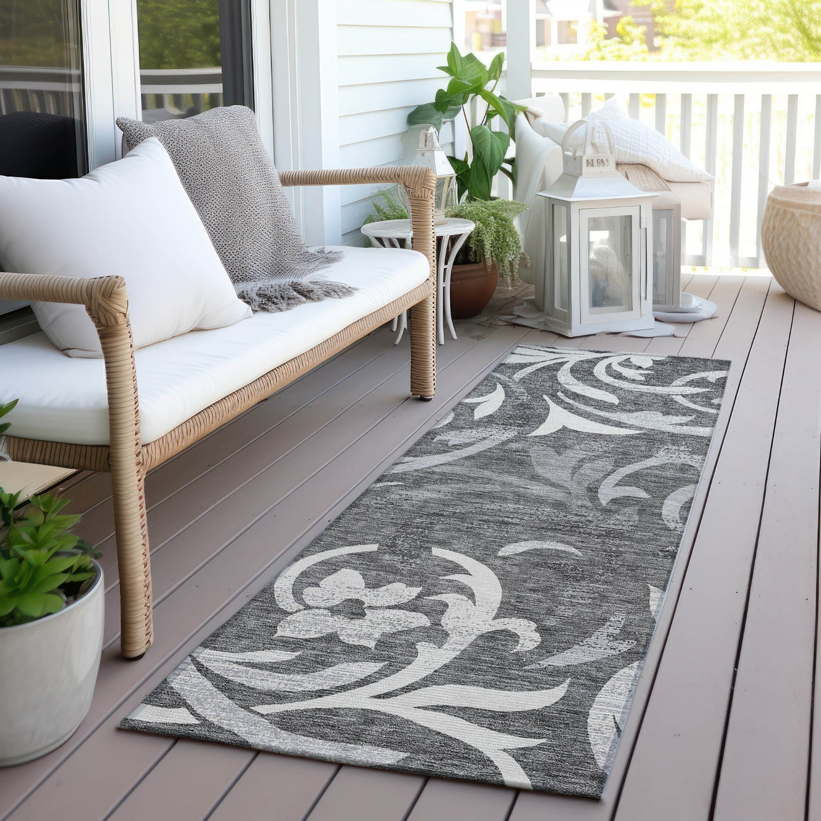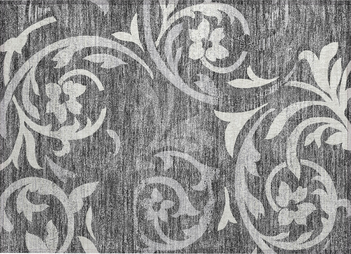 The elegant swirls of delicate vines on this rug create a mesmerizing pattern, ideal for adding a transitional touch to your decor. These vine swirls offer a perfect combination of elegance and calmness, enriching any living area with style. UV stabilized, ultra-thin, machine-washable, and family and pet-friendly, it's a practical yet sophisticated choice for contemporary living.