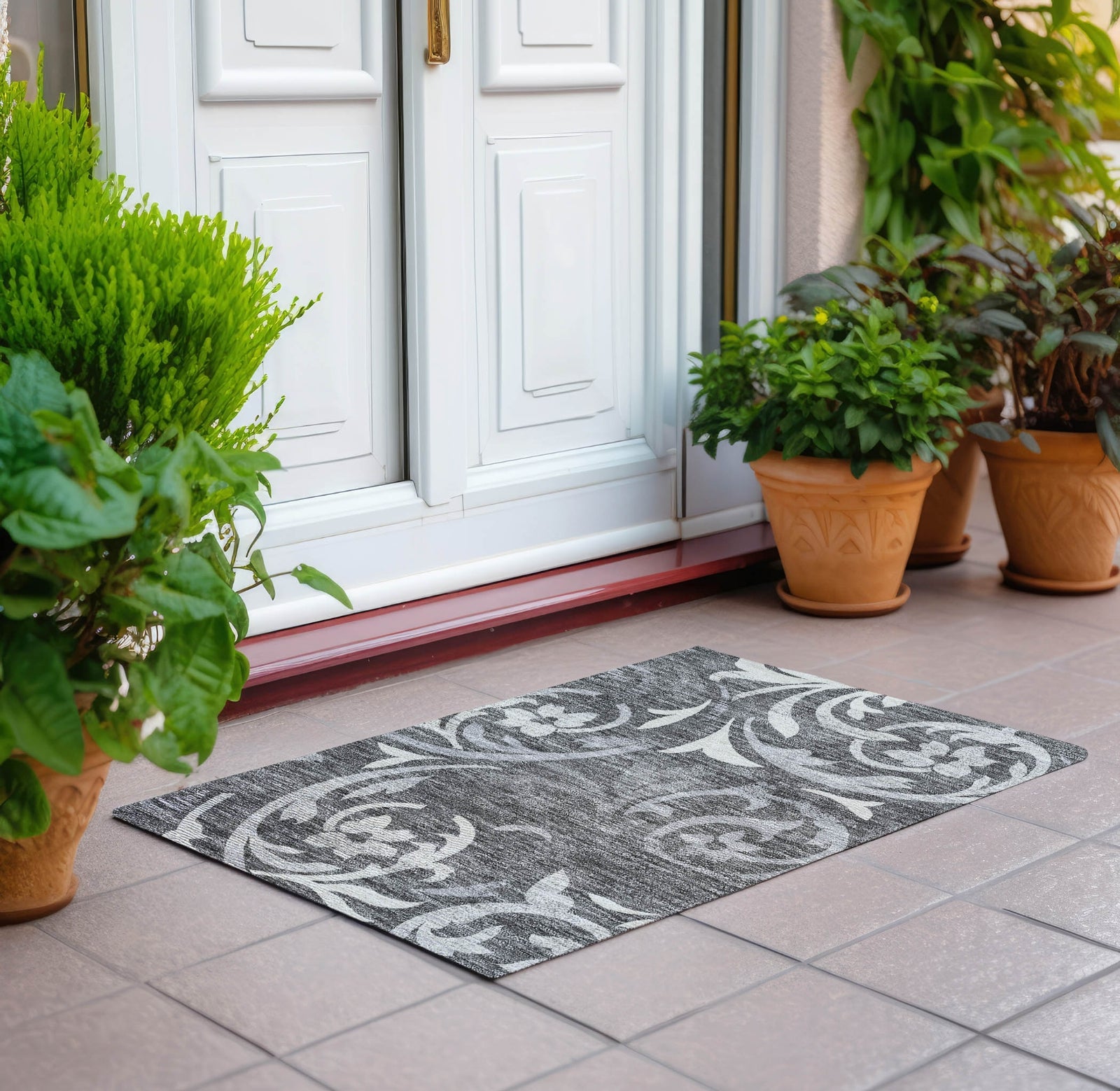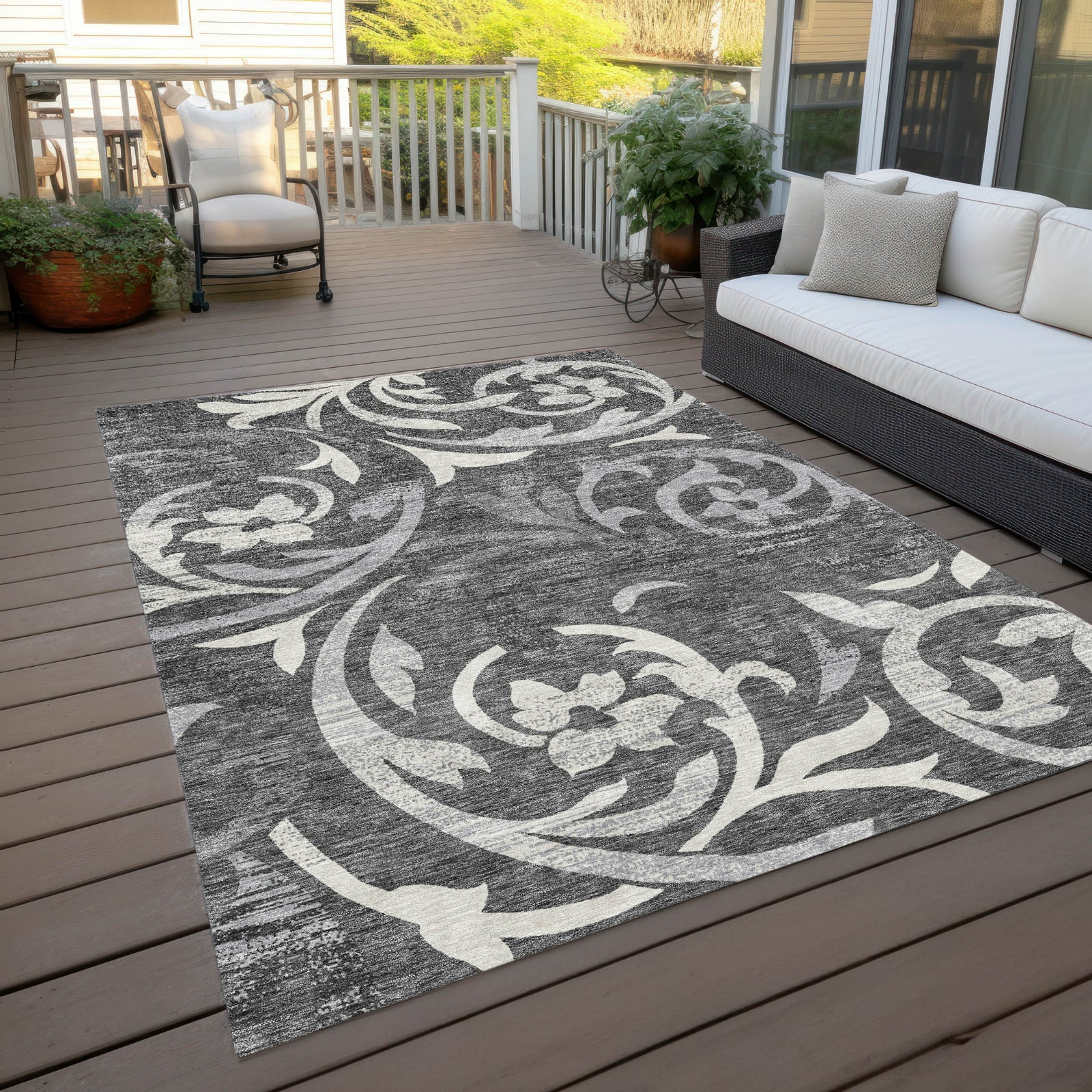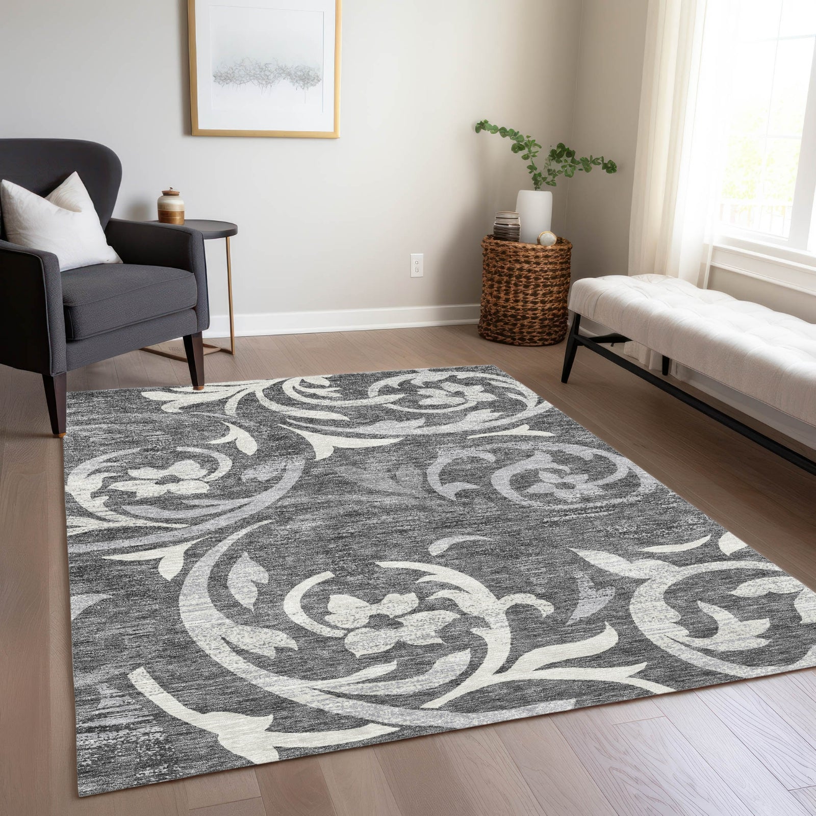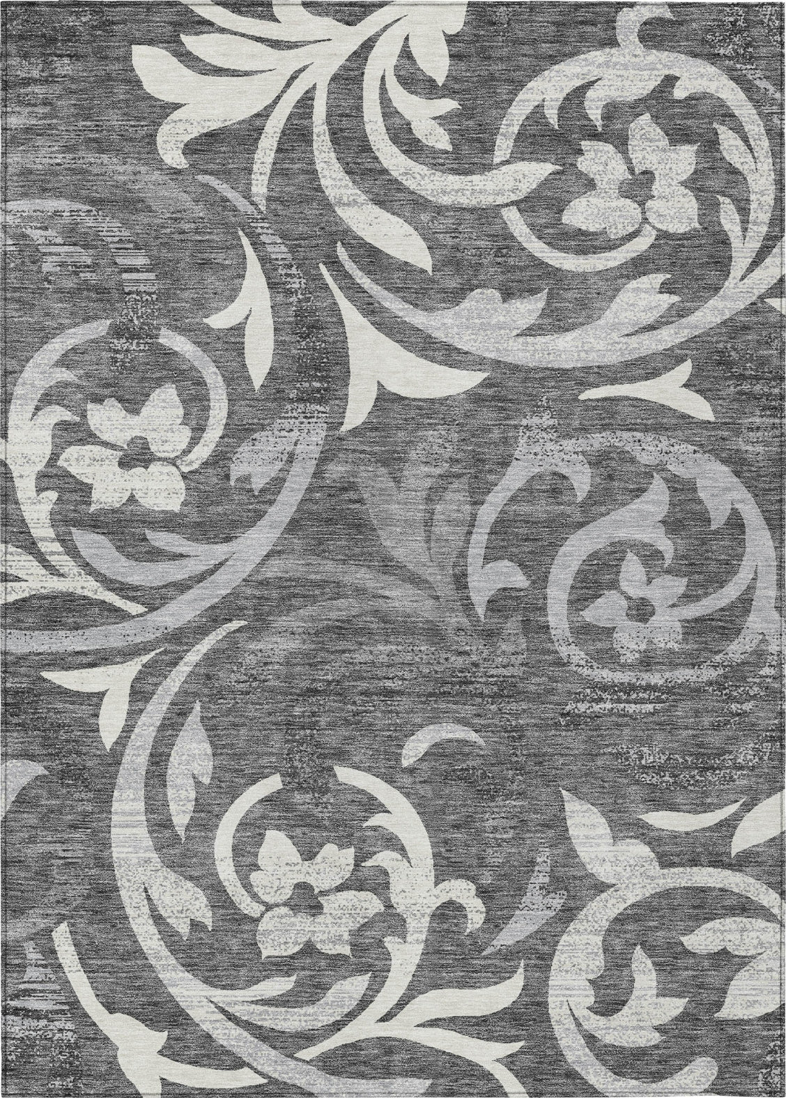 The elegant swirls of delicate vines on this rug create a mesmerizing pattern, ideal for adding a transitional touch to your decor. These vine swirls offer a perfect combination of elegance and calmness, enriching any living area with style. UV stabilized, ultra-thin, machine-washable, and family and pet-friendly, it's a practical yet sophisticated choice for contemporary living.