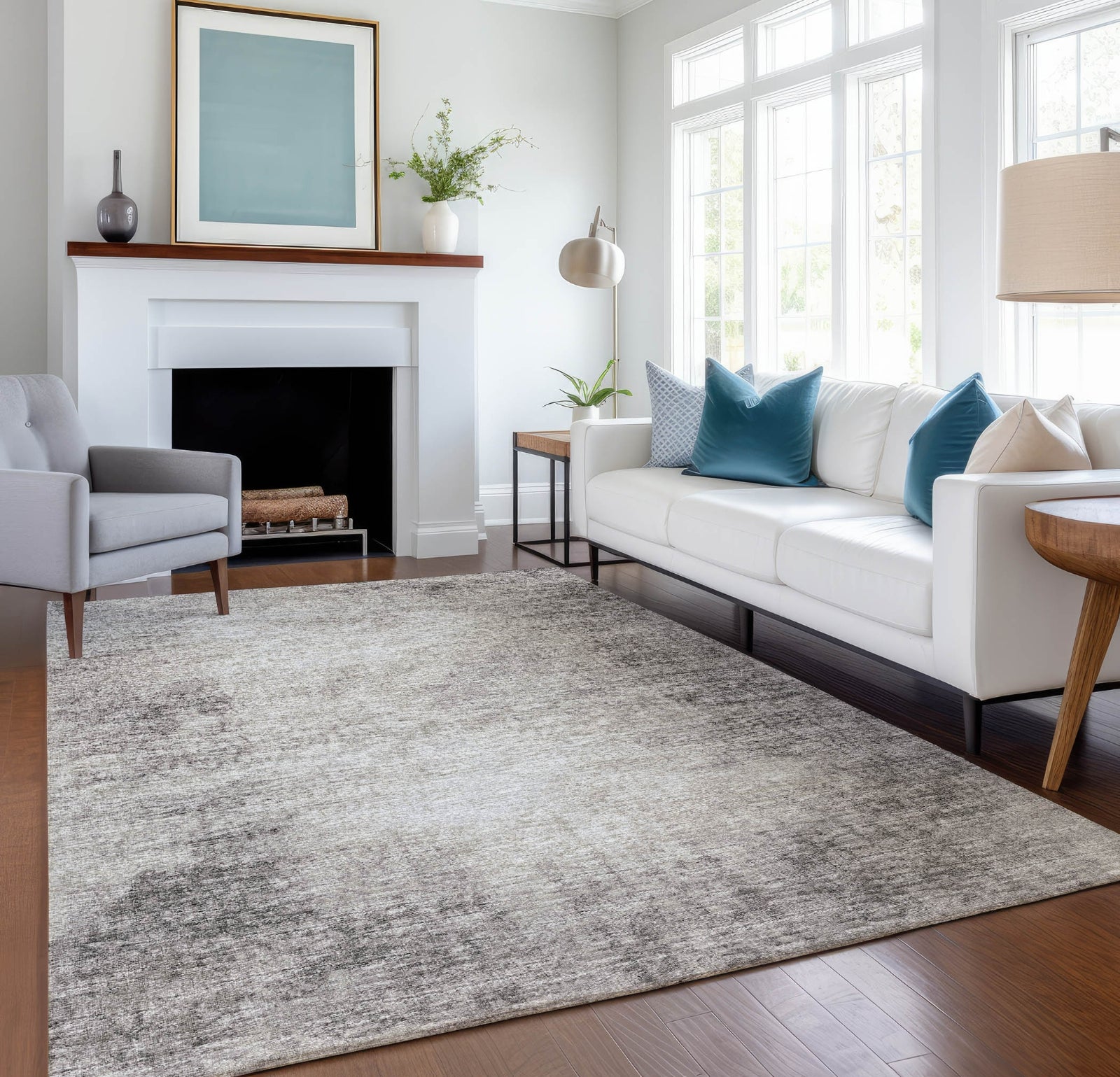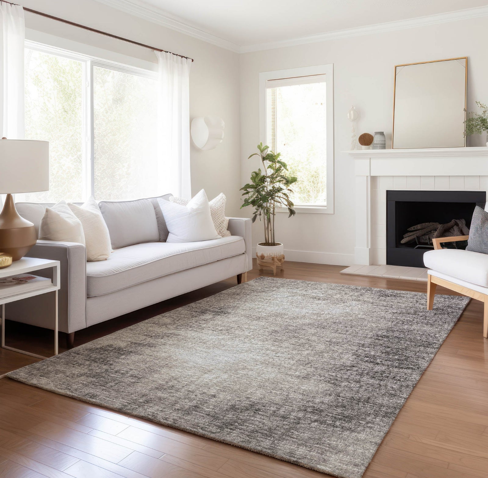 Embrace the artistic flair of this transitional rug, featuring a captivating abstract motif that lightens in the center. This piece is perfect for enhancing both indoor and covered outdoor areas. It's crafted with a soft, thick, and plush microfiber pile, and its premium machine washable quality ensures it is both family and pet-friendly.