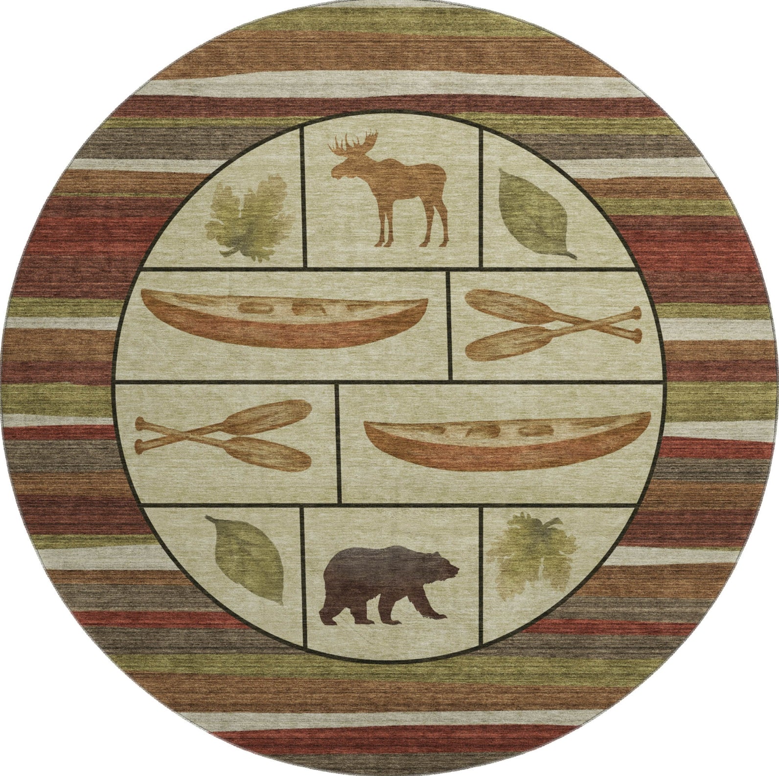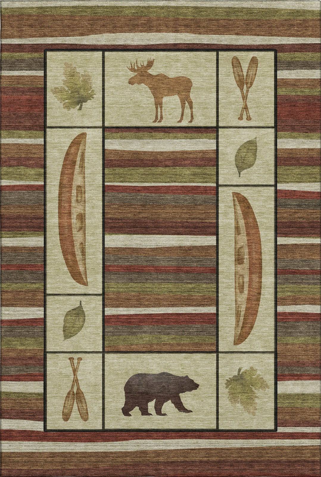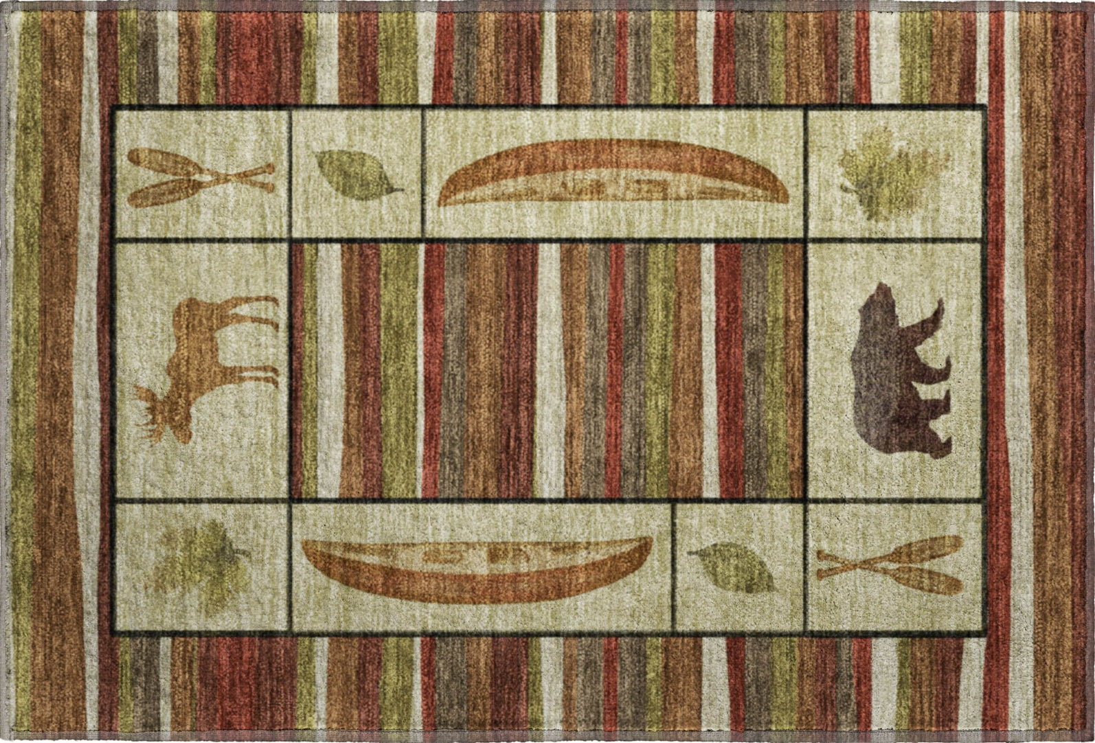 Imagine adding a touch of wilderness to your home with a rug featuring bears, moose, trees, canoes, and leaves, creating an enchanting wildlife vibe. This lodge-inspired design with stripes and cabin elements offers a cozy rustic charm. Perfect for use indoors and in covered outdoor areas, this rug boasts a soft, thick, and plush microfiber pile. It's premium machine washable and family and pet-friendly, ensuring both comfort and practicality.