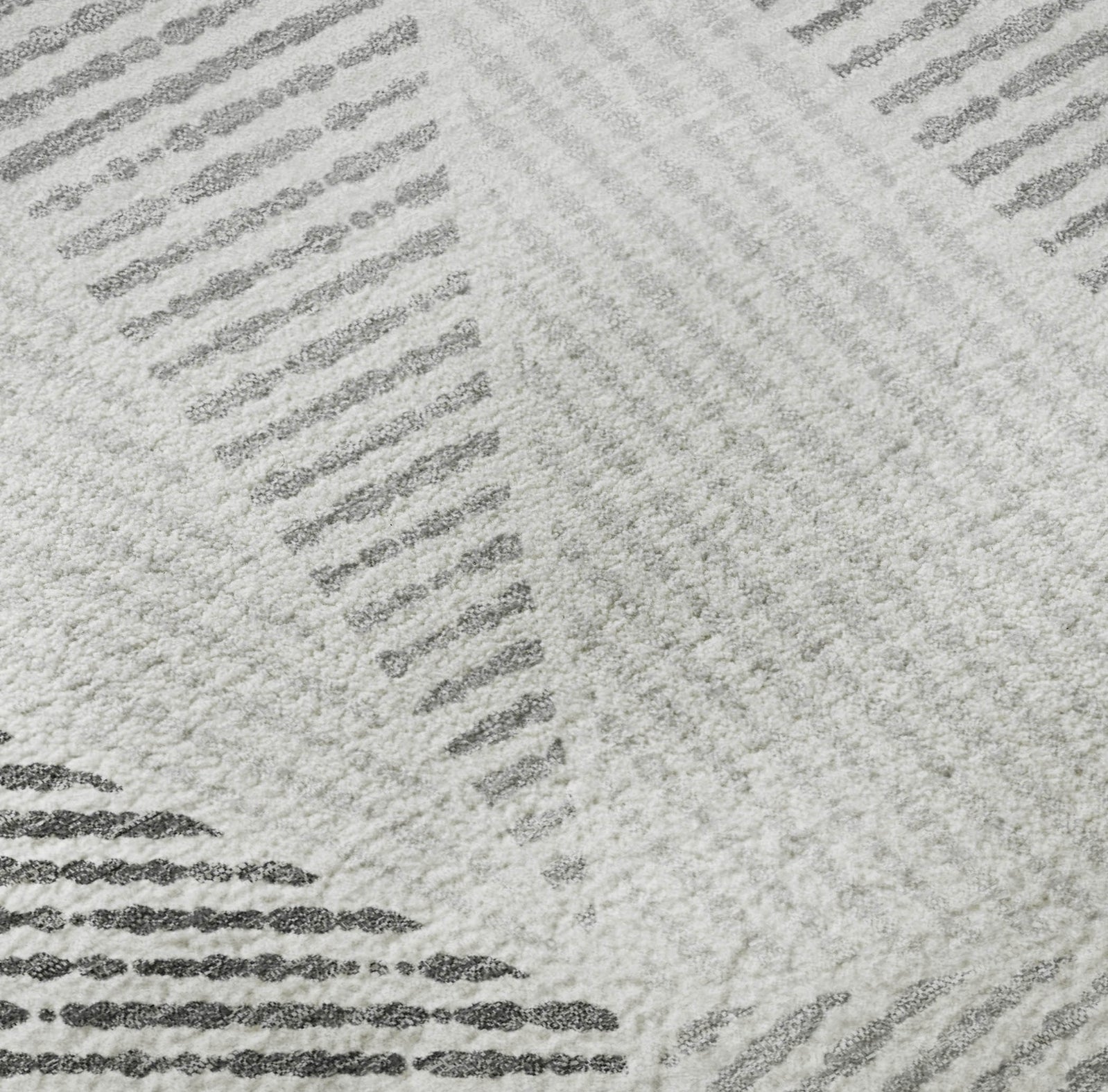 Interlocking triangles paired with jagged inner lines give this rug a distinctive geometric pattern, adding texture and depth to transitional decor. The dynamic design introduces a sense of movement, enhancing the room with a stylish and engaging touch. Its unique mix of traditional and modern elements offers a polished and elegant look. Perfect for indoor and covered outdoor use, this rug features a thick, plush microfiber pile that offers soft comfort for every step. Its premium machine washable construction makes cleaning a breeze, while its family and pet-friendly design ensures it can handle the demands of everyday life. Add a touch of cozy elegance to your space with this versatile rug.