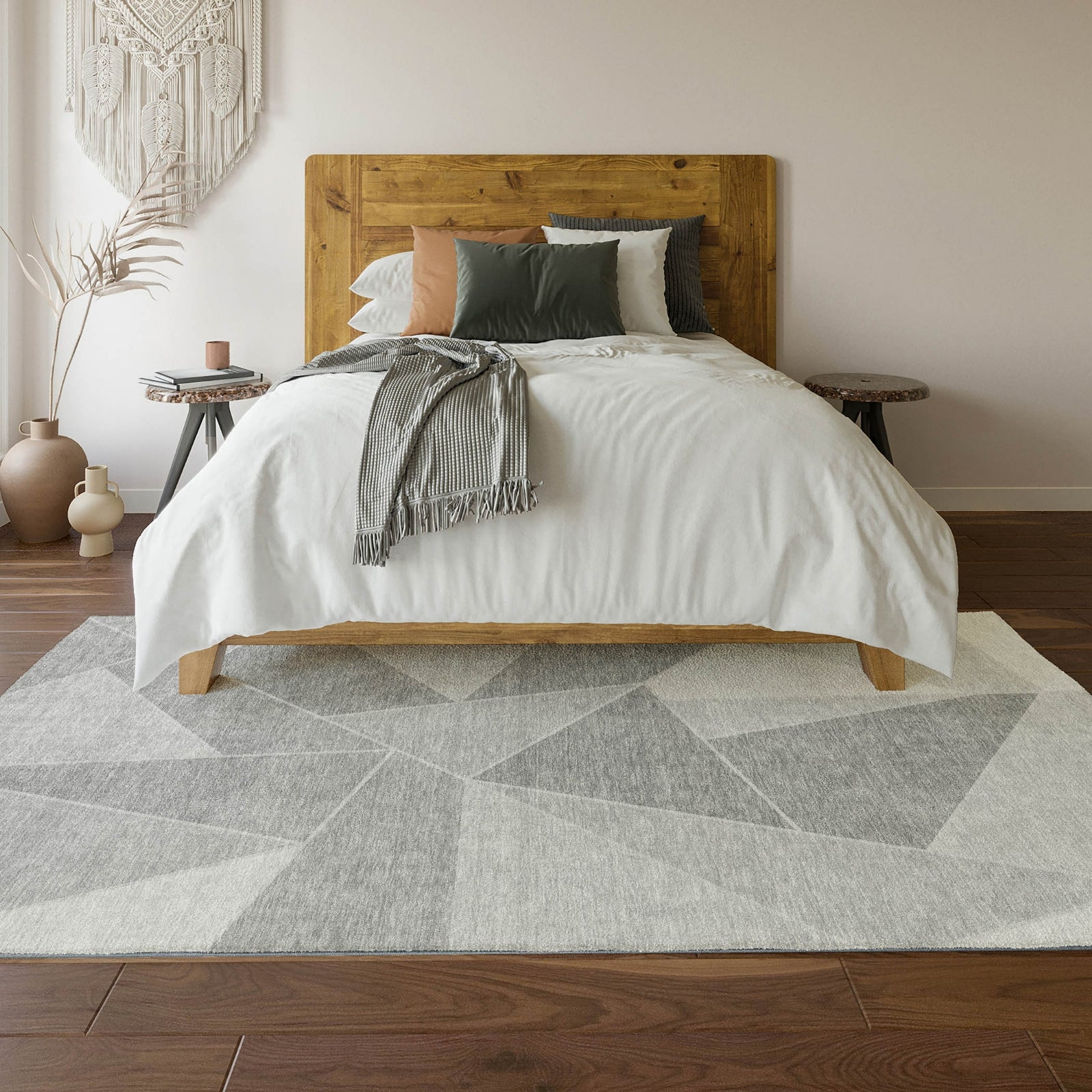 Triangles and straight-edged shapes give this rug a distinctive geometric pattern, adding texture and depth to transitional decor. The dynamic design introduces a sense of movement, enhancing the room with a stylish and engaging touch. Its unique mix of classic and modern influences offers a polished and contemporary look. Perfect for indoor and covered outdoor use, this rug features a thick, plush microfiber pile that offers soft comfort for every step. Its premium machine washable construction makes cleaning a breeze, while its family and pet-friendly design ensures it can handle the demands of everyday life. Add a touch of cozy elegance to your space with this versatile rug.