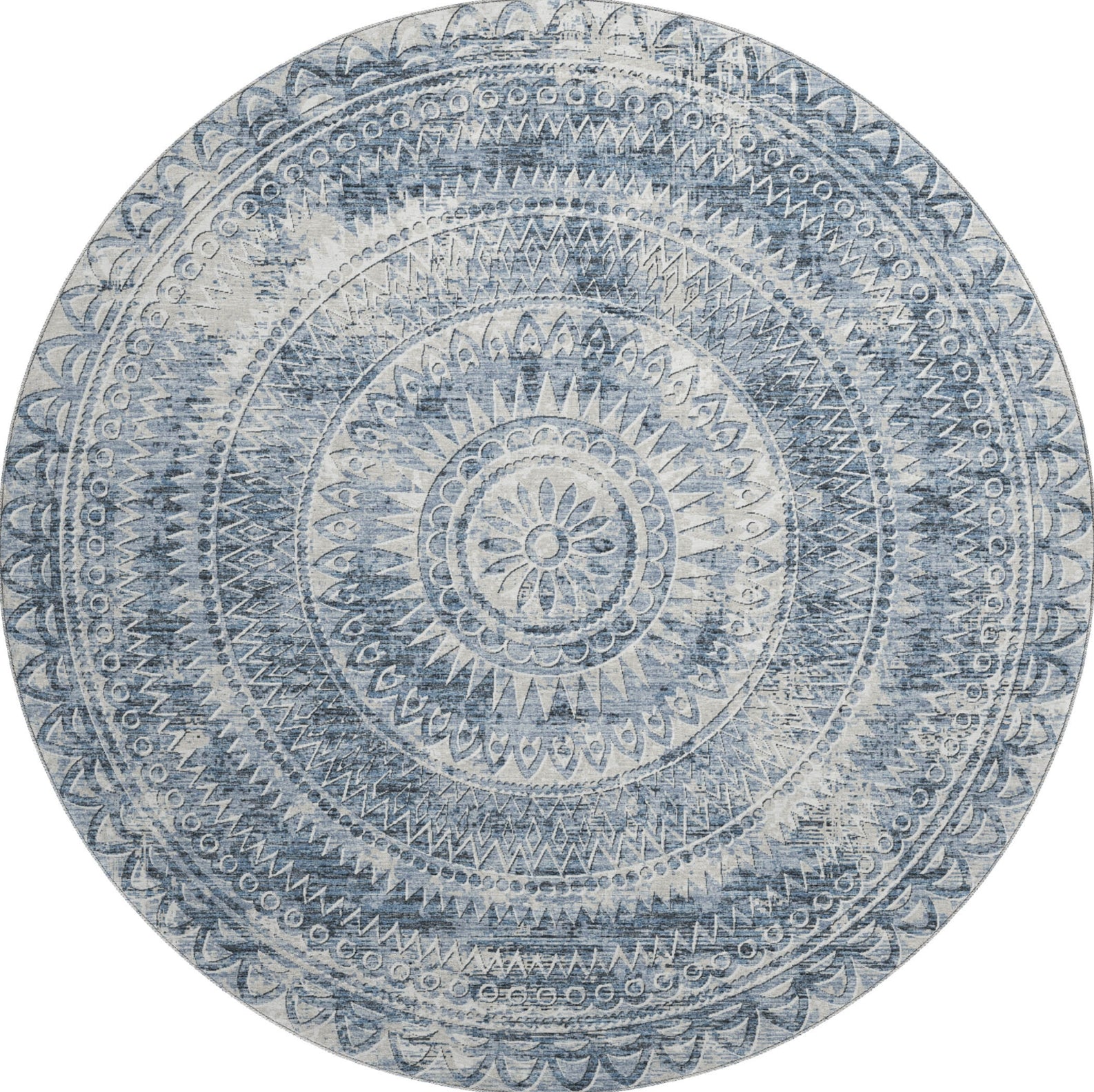 Discover the unique charm of this rug, adorned with a distressed medallion and semi-circular motifs at the corners, seamlessly integrating with transitional decor themes. Perfect for both indoor and covered outdoor use, it boasts a soft, thick, and plush microfiber pile. This rug is also premium machine washable, making it a favored choice for a busy household.