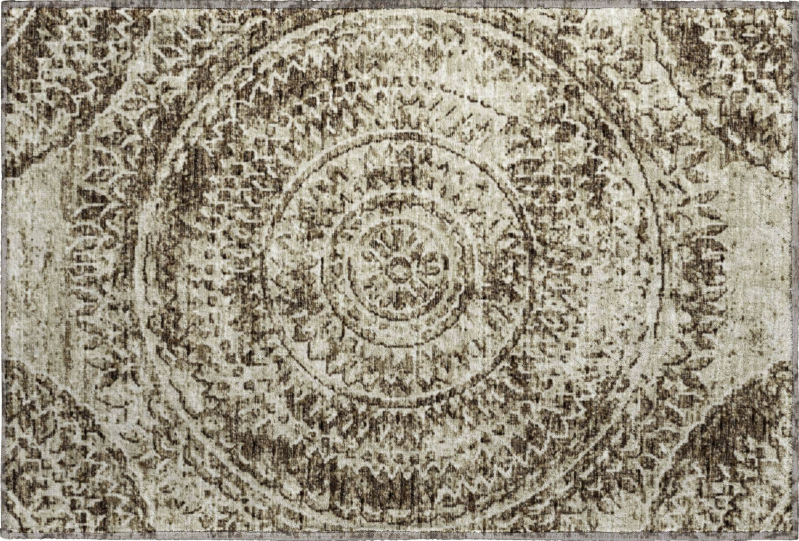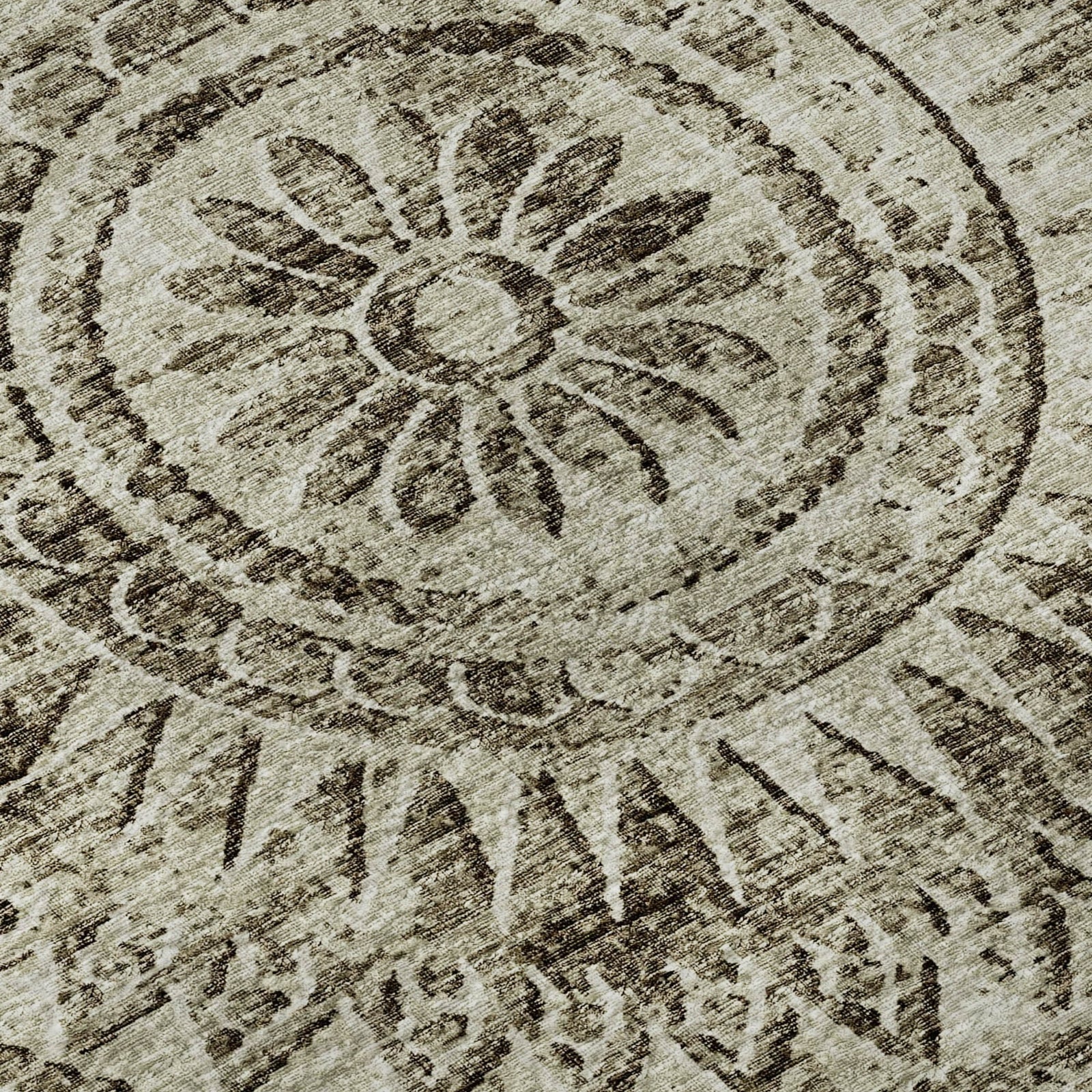Discover the unique charm of this rug, adorned with a distressed medallion and semi-circular motifs at the corners, seamlessly integrating with transitional decor themes. Perfect for both indoor and covered outdoor use, it boasts a soft, thick, and plush microfiber pile. This rug is also premium machine washable, making it a favored choice for a busy household.