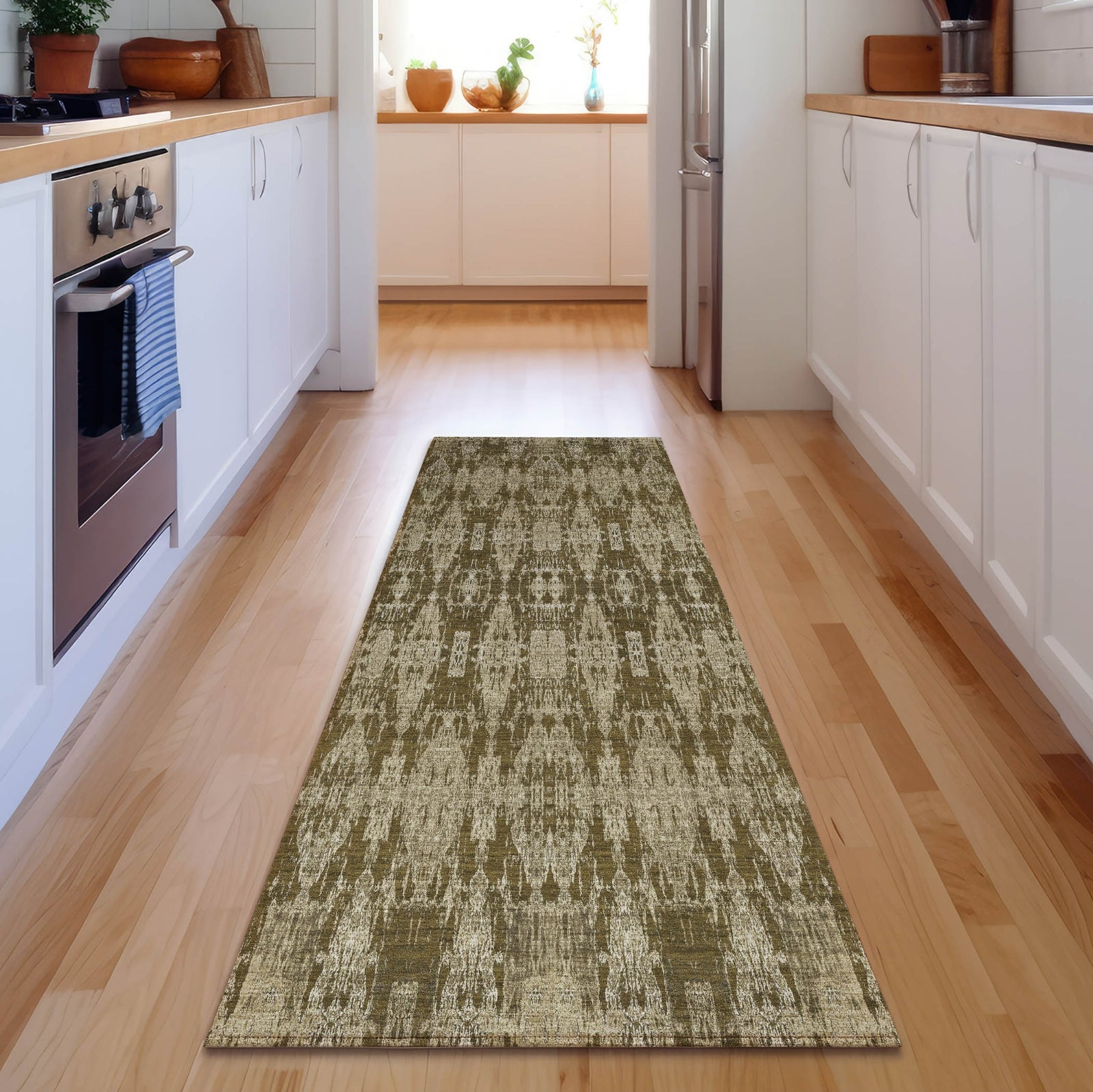 The striking bands of Moroccan-style motifs on this rug create a beautiful interplay of tradition and modernity. Its bold design adds a layer of texture and sophistication, making it an excellent choice for enhancing your decor. With its rich details and transitional appeal, this rug effortlessly complements any room. Perfect for indoor and covered outdoor use, this rug features a thick, plush microfiber pile that offers soft comfort for every step. Its premium machine washable construction makes cleaning a breeze, while its family and pet-friendly design ensures it can handle the demands of everyday life. Add a touch of cozy elegance to your space with this versatile rug.