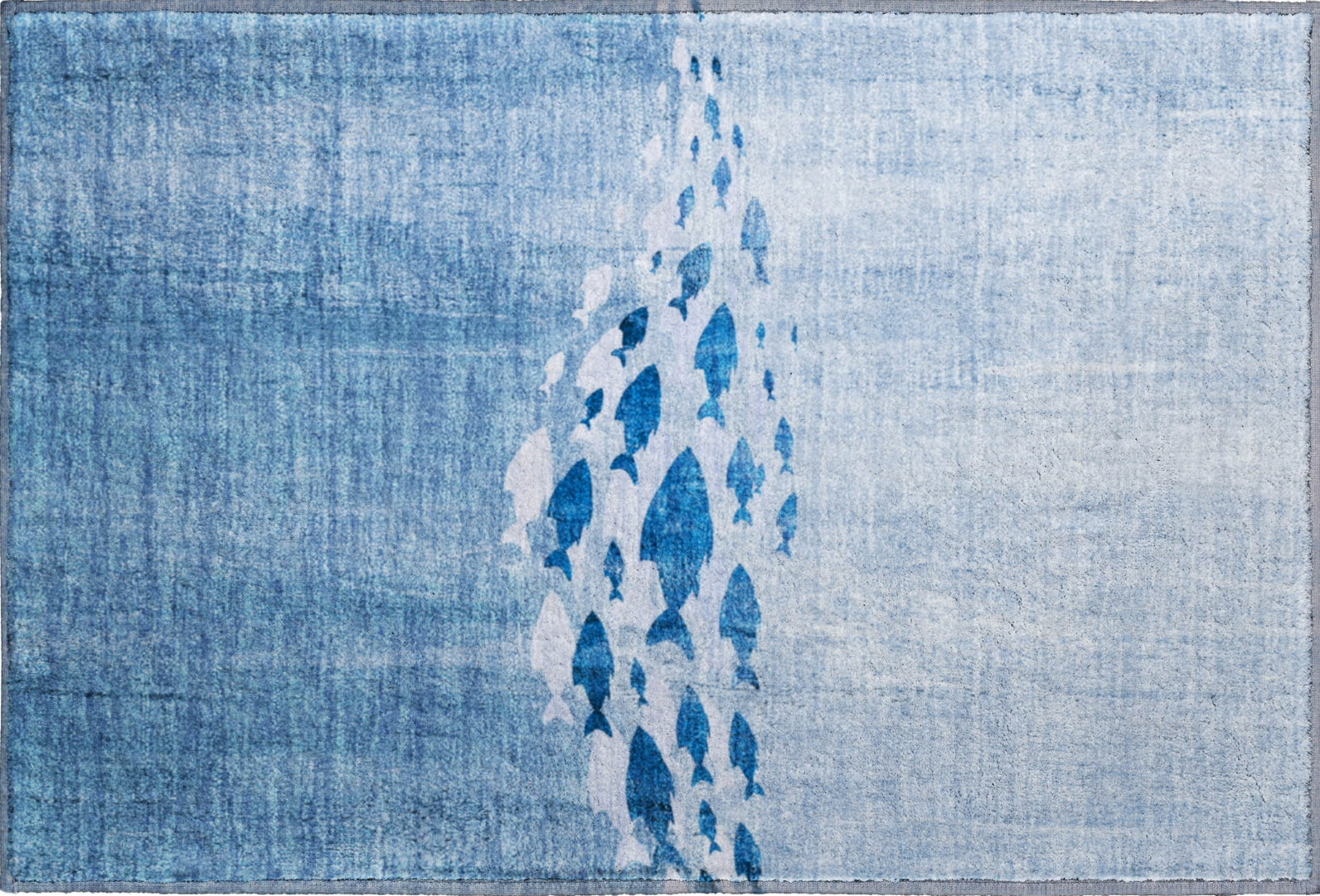 A school of fish is beautifully centered in this rug's gradient ombre effect, adding a distinctive nautical touch to transitional decor. The dynamic pattern introduces a sense of movement, enhancing the room with a soothing and engaging touch. Its unique mix of traditional and modern elements offers a polished and elegant look. Perfect for indoor and covered outdoor use, this rug features a thick, plush microfiber pile that offers soft comfort for every step. Its premium machine washable construction makes cleaning a breeze, while its family and pet-friendly design ensures it can handle the demands of everyday life. Add a touch of cozy elegance to your space with this versatile rug.