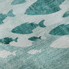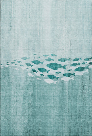 A school of fish is beautifully centered in this rug's gradient ombre effect, adding a distinctive nautical touch to transitional decor. The dynamic pattern introduces a sense of movement, enhancing the room with a soothing and engaging touch. Its unique mix of traditional and modern elements offers a polished and elegant look. Perfect for indoor and covered outdoor use, this rug features a thick, plush microfiber pile that offers soft comfort for every step. Its premium machine washable construction makes cleaning a breeze, while its family and pet-friendly design ensures it can handle the demands of everyday life. Add a touch of cozy elegance to your space with this versatile rug.