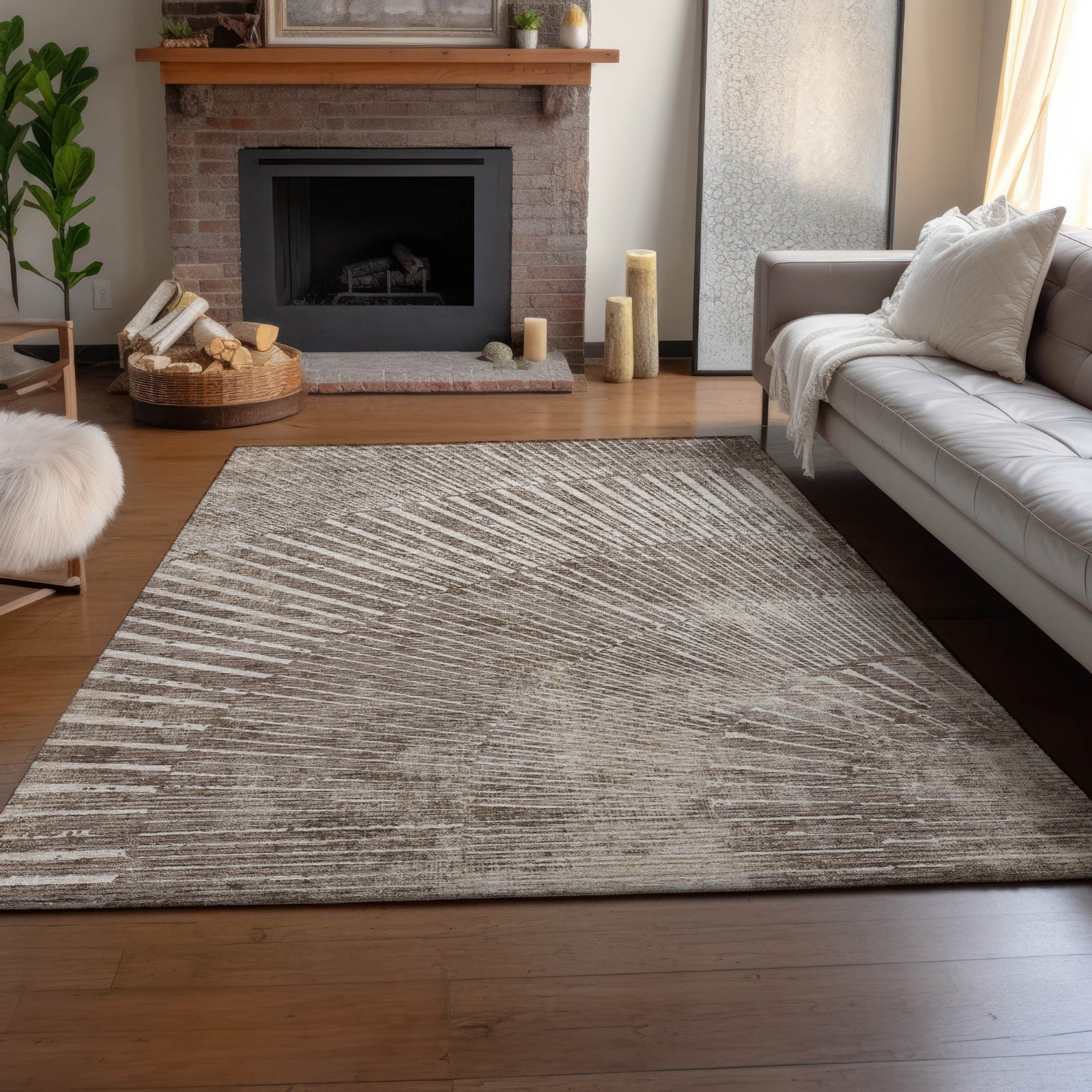 Featuring an organic pattern with a fan-like design that adds depth and dimension, this rug offers a modern flair to transitional decor. The intricate design introduces a contemporary, sophisticated element that enhances various room settings. The plush microfiber pile provides comfort, and UV stabilization makes it suitable for indoor and covered outdoor use. Additionally, it is premium machine washable, making it a great choice for homes with families and pets.