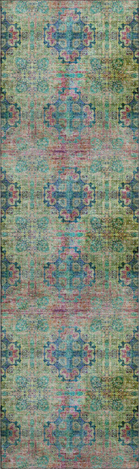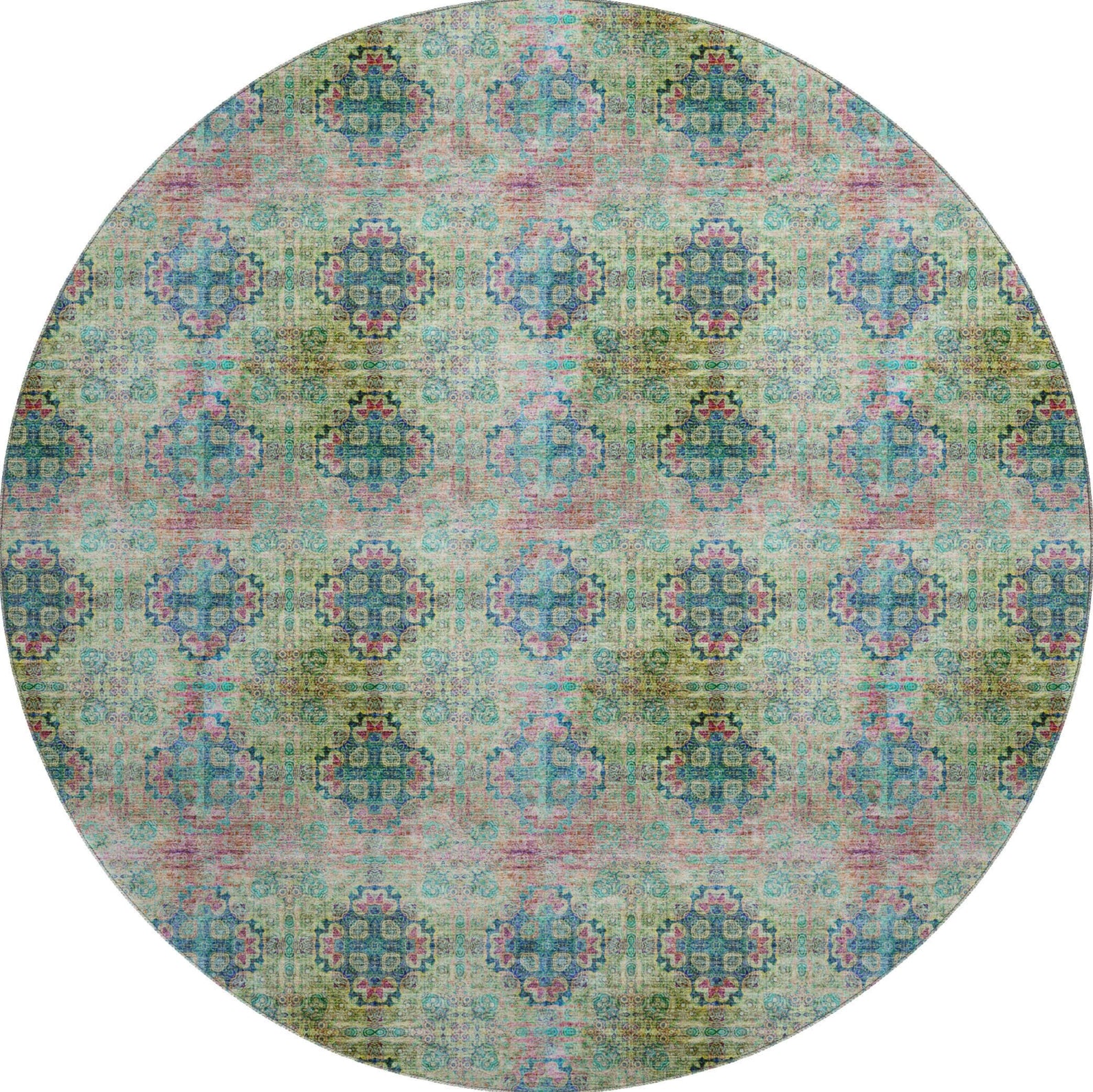 The rug's small scalloped medallions offer a kaleidoscope vibe, delivering a transitional style with its organic pattern. The vibrant and artistic design introduces a dynamic element to your room, seamlessly fitting into various interior themes with its captivating appeal. Experience the luxurious plush microfiber pile and UV stabilization for durability in indoor and covered outdoor areas. Additionally, it is premium machine washable, perfect for homes with families and pets.
