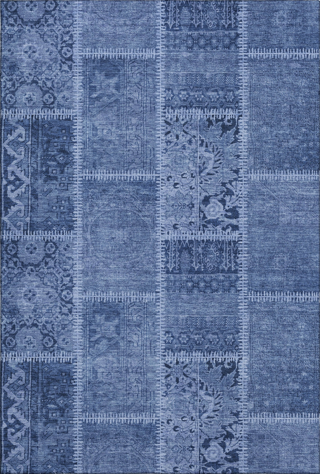 Stitched panels give this rug a distinctive patchwork pattern, adding texture and depth to transitional decor. The intricate design introduces a sense of handcrafted movement, enhancing the room with a stylish and engaging touch. Its unique mix of classic patchwork motifs and modern influences offers a polished and elegant look. Perfect for indoor and covered outdoor use, this rug features a thick, plush microfiber pile that offers soft comfort for every step. Its premium machine washable construction makes cleaning a breeze, while its family and pet-friendly design ensures it can handle the demands of everyday life. Add a touch of cozy elegance to your space with this versatile rug.