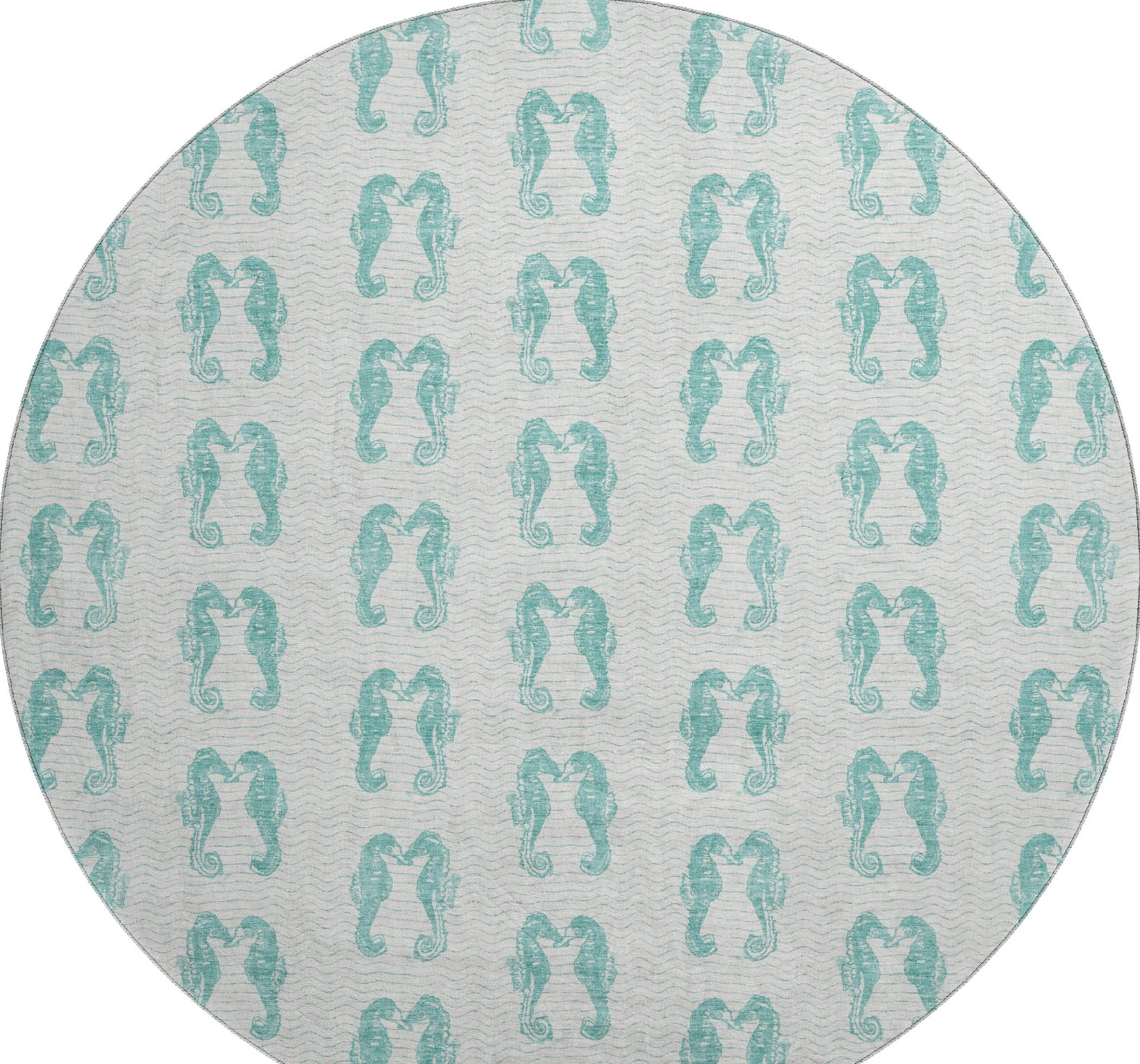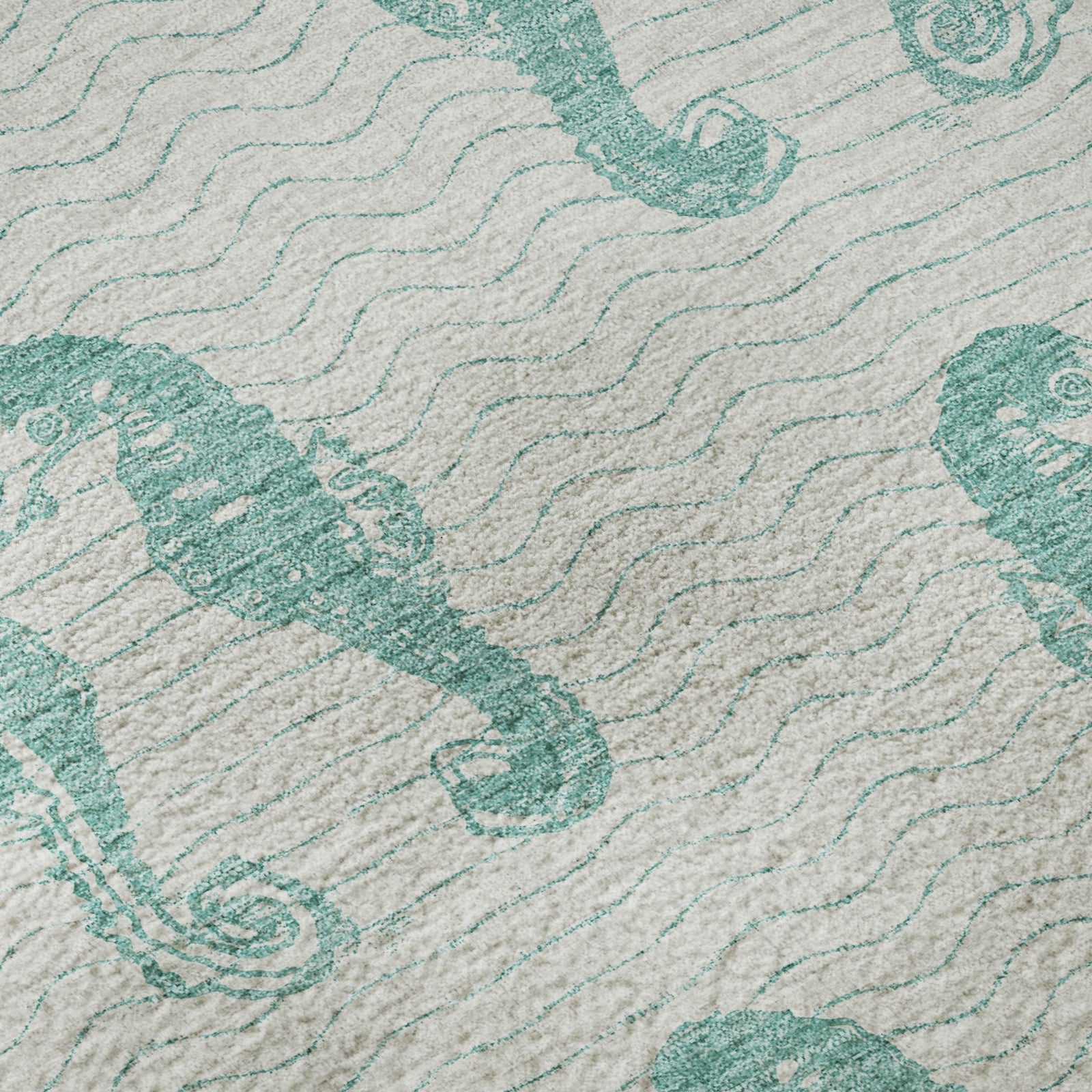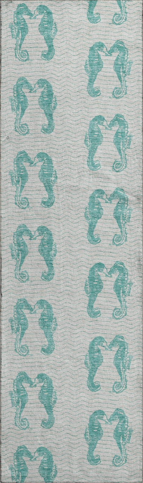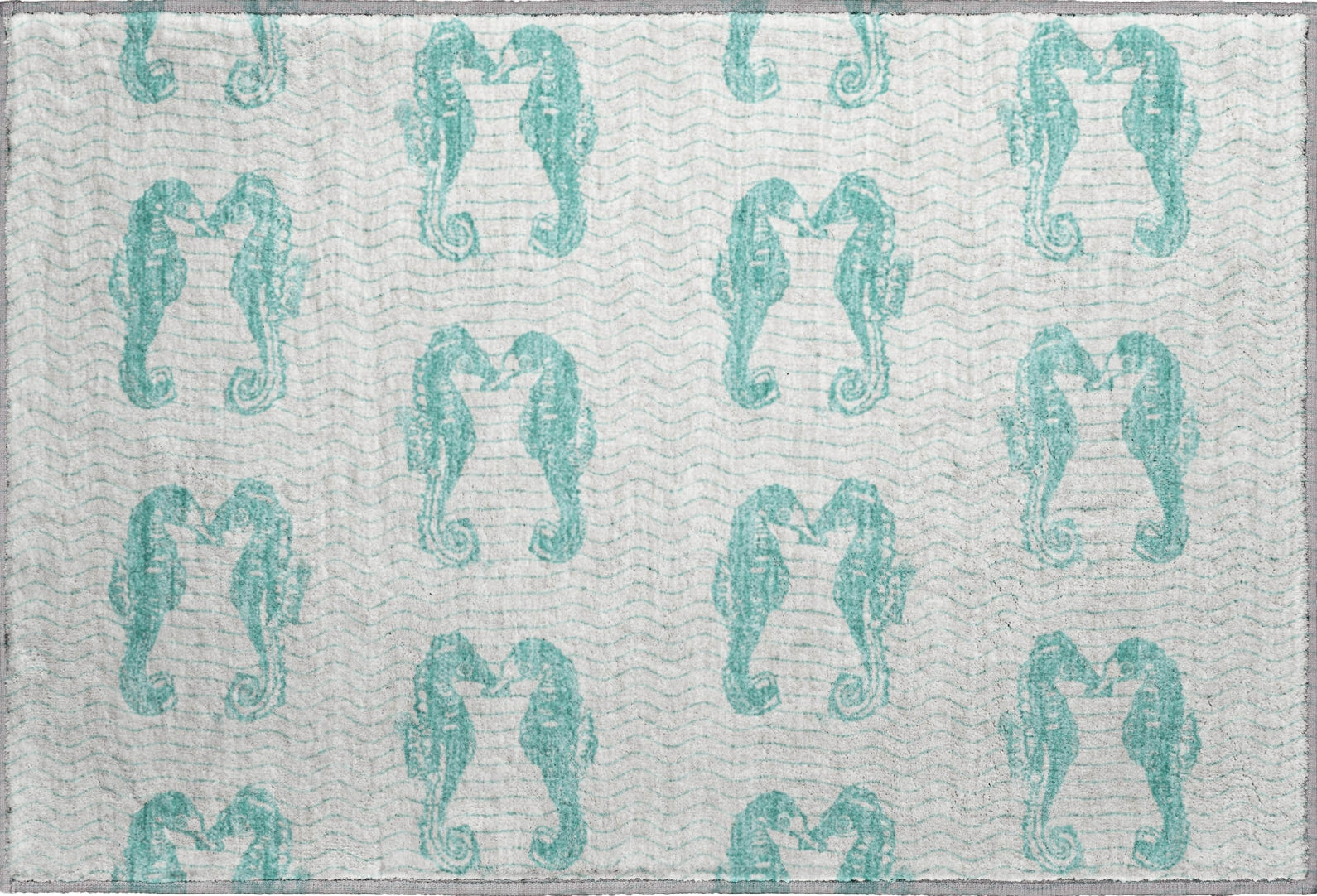 Enhance your space with a rug adorned with paired seahorses, creating a beautiful coastal pattern. This design adds a touch of whimsy and elegance to any room. Suitable for indoor and covered outdoor areas, it boasts a soft, thick, and plush microfiber pile. Additionally, it's premium machine washable and family and pet-friendly, making it both stylish and convenient.