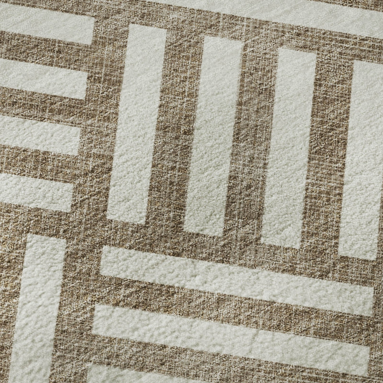 Intersecting wide lines paired with box formations give this rug a distinctive geometric pattern, adding texture and depth to transitional decor. The dynamic design introduces a sense of movement, enhancing the room with a stylish and engaging touch. Its unique mix of traditional and modern elements offers a polished and elegant look. Perfect for indoor and covered outdoor use, this rug features a thick, plush microfiber pile that offers soft comfort for every step. Its premium machine washable construction makes cleaning a breeze, while its family and pet-friendly design ensures it can handle the demands of everyday life. Add a touch of cozy elegance to your space with this versatile rug.