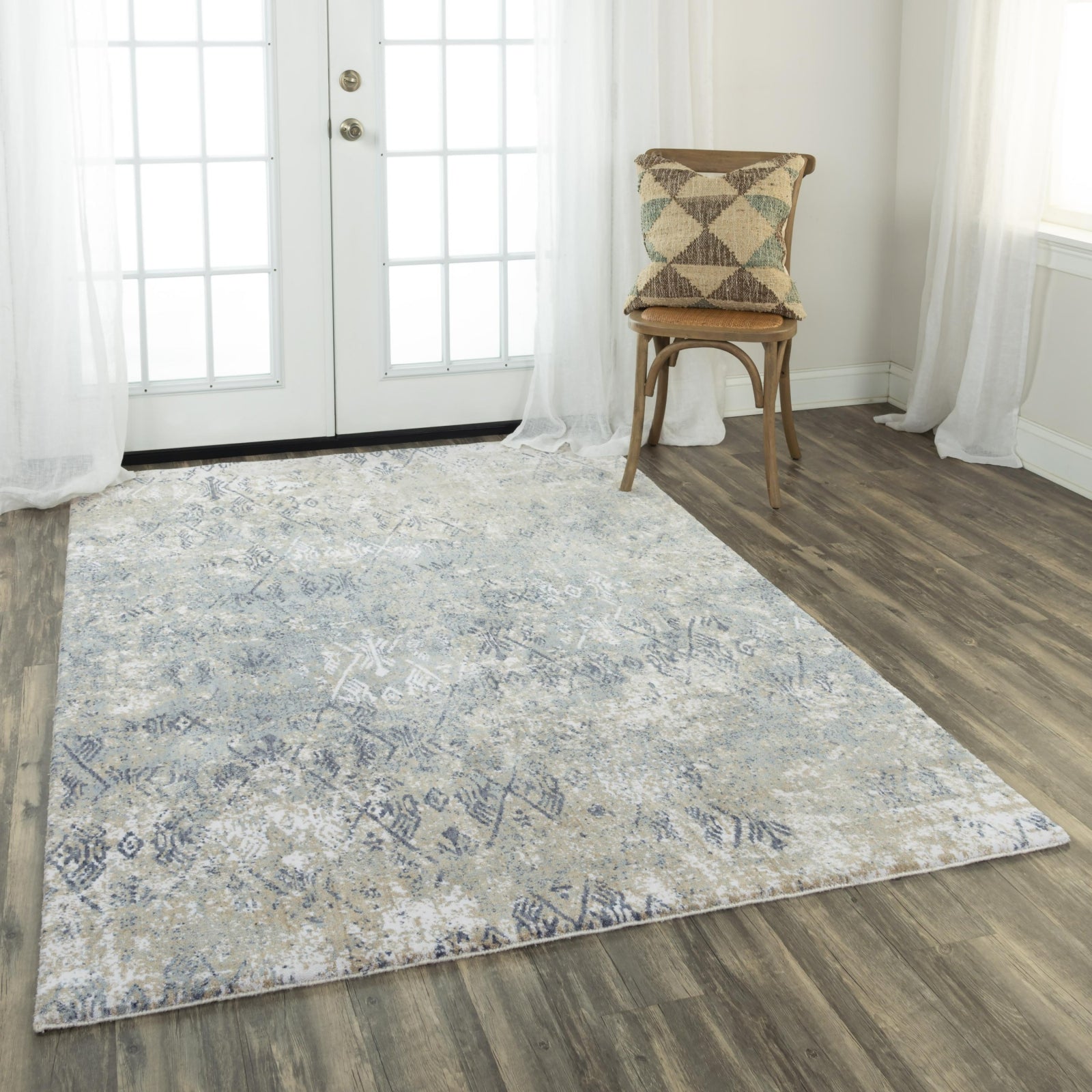 The distinct geometric patterns in this Rizzy Home Elite Rug have been distressed, fading them into neutral grey, beige, and ivory, obscuring their boldness. Made from durable 100-percent recycled polyester, it is suitable for high traffic areas, such as a business office or home entry way. A beautiful addition to your transitional or contemporary style decor. The edges are hand-serged to give you that clean straight look on all sides.