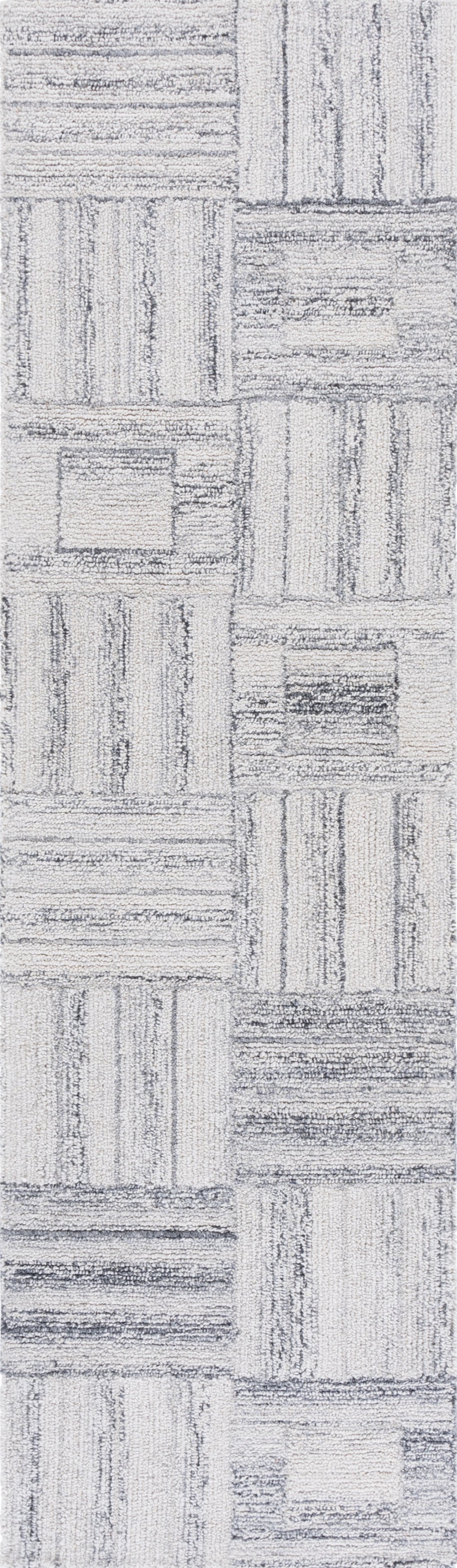 Elevate your space with this exquisite hand-tufted runner area rug, crafted with precision in India. Spanning a length of 8 feet and a width of 2 feet 3 inches, this 1/2 inch high rug is a seamless blend of durability and luxury. The modern style is captured in the versatile grey hues and an intriguing geometric pattern that features a series of varied rectangles and lines, providing an engaging texture and contemporary appeal.
