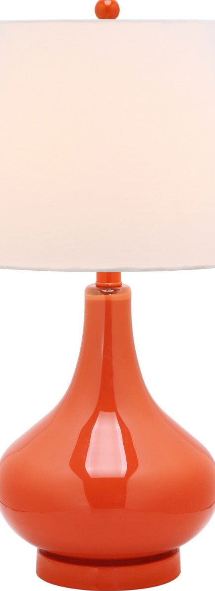 Reflect an aura of sophistication with the glimmering blood orange Amy Gourd Glass Lamp with matching finial metal base and neck. Complemented with an elegantly tapered pure cotton shade that illuminates the room.
